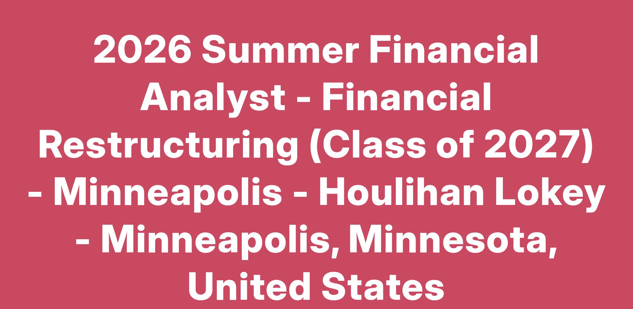 Summer Financial Analysts in Financial Restructuring will work on a variety of transactions within the Financial Restructuring business, including creditor- and debtor-side restructurings, liability management, capital solutions and distressed M&A. The group offers a unique opportunity to work on a variety of projects that provide exposure to various financial advisory and investment banking products and industries. These services include in and out of court restructurings, debt and equity financings, exchange offers and tenders, distressed M&A advisory services, and special situations transactions. The environment at Houlihan Lokey is aggressive and entrepreneurial and, as such, rewards Summer Financial Analysts with substantial responsibility.