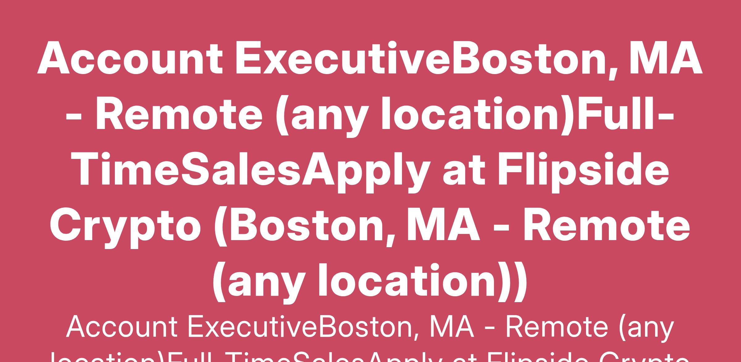 Account ExecutiveBoston, MA - Remote (any location)Full-TimeSalesApply at Flipside Crypto (Boston, MA - Remote (any location))