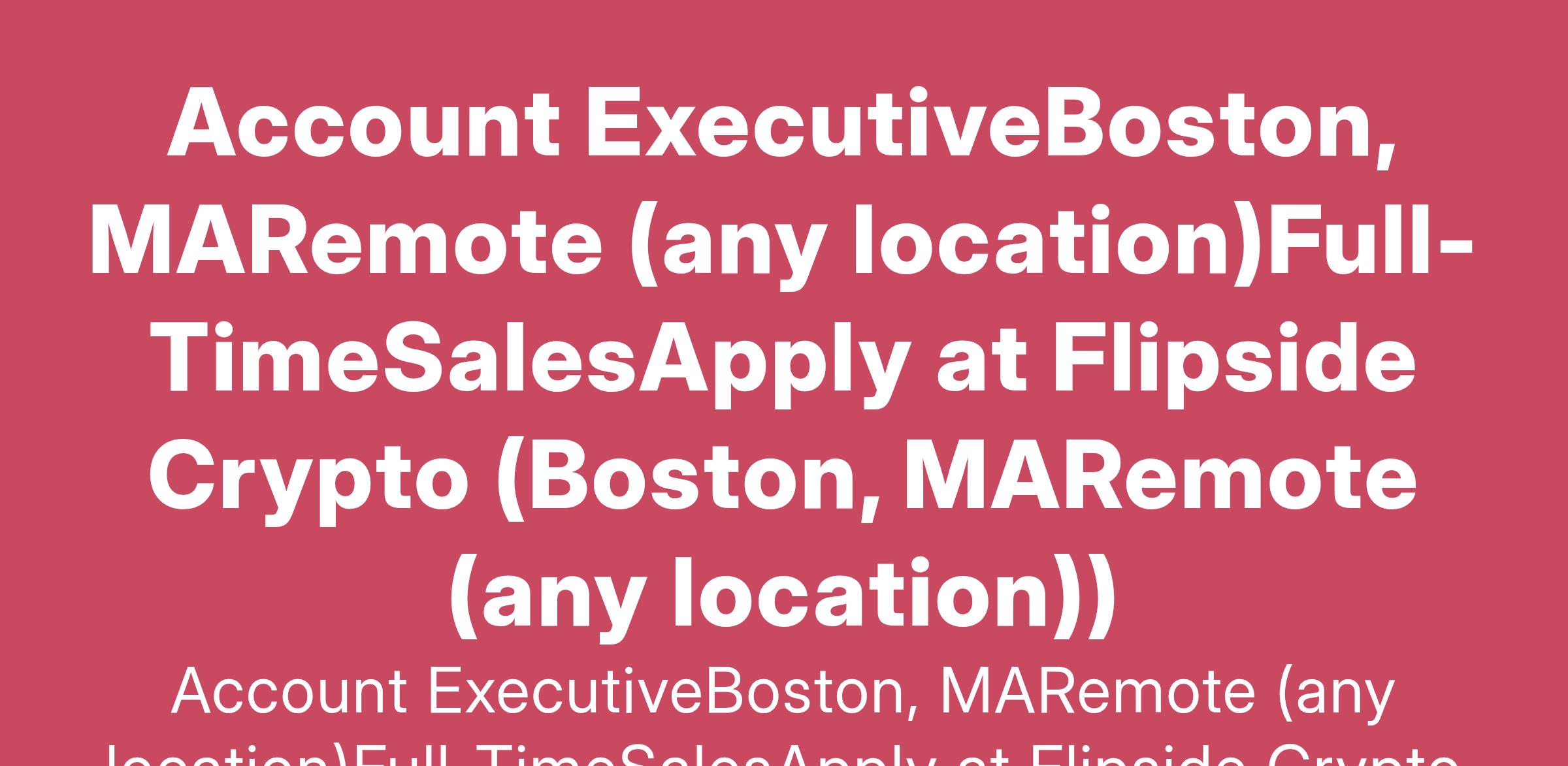 Account ExecutiveBoston, MARemote (any location)Full-TimeSalesApply at Flipside Crypto (Boston, MARemote (any location))