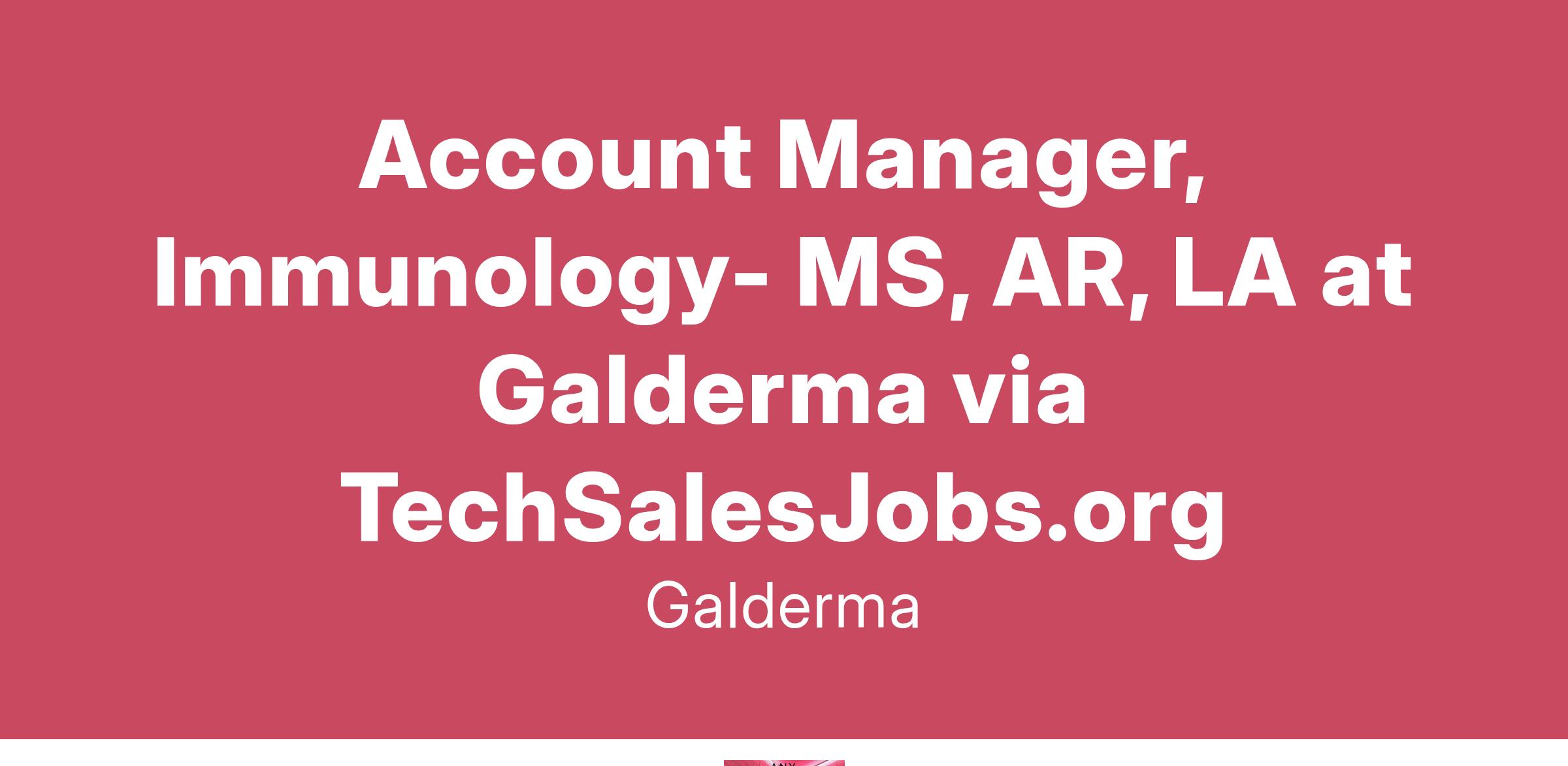 Job Title: Account Manager- Immunology Location: Jackson, MS ( Little Rock, Monroe/Ruston) Job Description: Immunology Account Manager is responsible for achieving/exceeding Galderma portfolio sales and executing strategic objectives across high-valued (large, organized) customers within assigned customer segments (including but not limited to Dermatologists, Pharmacy, Integrated Health Networks, and professional organizations). Account Managers will effectively promote Galderma\\\'s prescription dermatology biologic and consumer product portfolio, as assigned, requiring advanced skills in clinical, operational, and financial commercial selling.