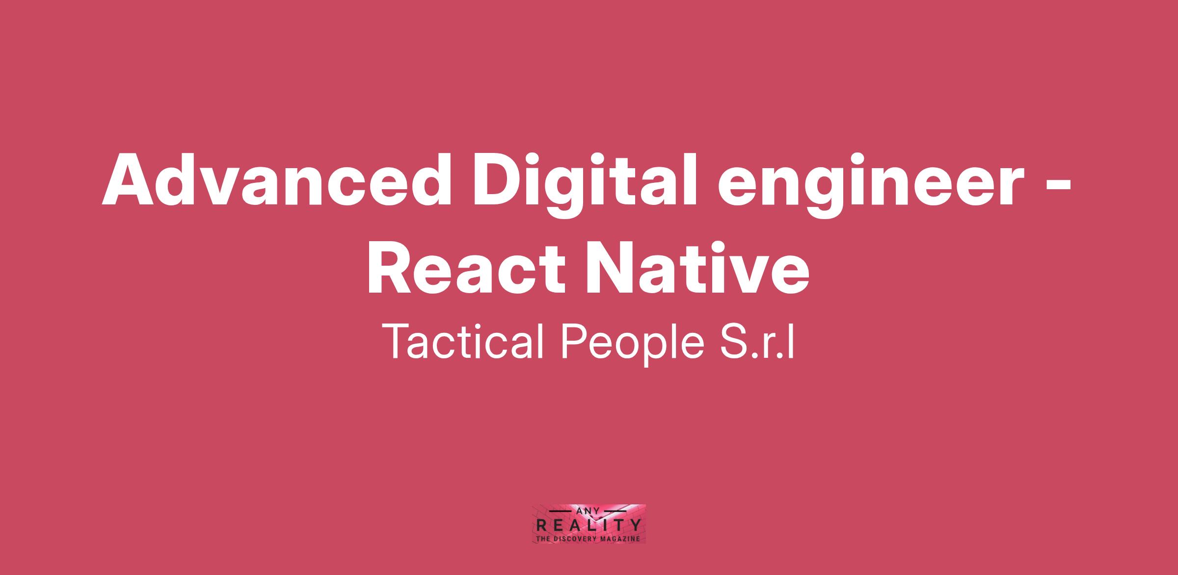 Unisciti a TACTICAL PEOPLE: Innovazione, Persone e Crescita nel Cuore della Digital Transformation Da oltre 20 anni, TACTICAL PEOPLE si posiziona come leader nel mercato ICT, guidando con passione e competenza i nostri clienti di medie e grandi dimensioni attraverso il dinamico percorso della digital transformation. La nostra mission è chiara: non solo abbracciare il cambiamento tecnologico, ma guidarlo, creando soluzioni all'avanguardia che plasmino il futuro digitale. In TACTICAL PEOPLE, crediamo fortemente nel mettere le persone al centro di ogni nostra iniziativa. Le persone sono il cuore pulsante della nostra azienda; il loro benessere, la loro crescita e il loro sviluppo sono la nostra priorità. Ci impegniamo a condividere le strategie aziendali con trasparenza e a fornire formazione e supporto a ogni livello, garantendo che ogni membro del team sia equipaggiato per eccellere e innovare. Stiamo cercando individui che condividano la nostra visione, che siano guidati dalla passione per la tecnologia e che desiderino essere protagonisti nella costruzione di un futuro digitale più luminoso. Se sei pronto a far parte di una squadra che valorizza il talento, incoraggia la crescita personale e professionale e lavora in prima linea nel settore della digital transformation, TACTICAL PEOPLE è il posto giusto per te. Posizione Aperta: Advanced Digital engineer - React Native Sede: Full remote Descrizione del Ruolo: Il candidato ideale ha esperienza pregressa in React Native Cosa offriamo: Inserimento immediato in una Tech Community giovane e dinamica. TACTICAL LEARNING HUB, con corsi di aggiornamento e formazione. Il presente annuncio è rivolto ad entrambi i sessi, ai sensi delle leggi 903/77 e 125/91, e a persone di tutte le età e tutte le nazionalità, ai sensi dei decreti legislativi 215/03 e 216/03. I curricula dovranno pervenire completi di dicitura che autorizza il trattamento dei propri dati: “Si autorizza al trattamento dei dati personali ai sensi del D. Lgs. 196/2003.