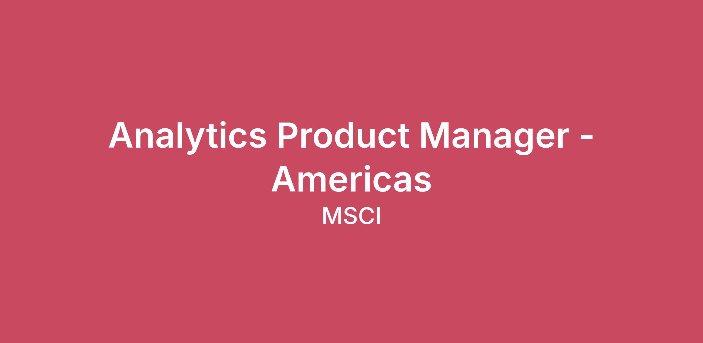 Your Team Responsibilities Position OverviewThis is a business leadership role that involves working extensively with clients as well as colleagues internally (Top Management, Coverage, Research and Technology groups). Travel and speaking engagements may be part of this role. Successful candidates have the opportunity to drive the strategic business agenda as well as the execution of business plans across functions, and to develop detailed insights into the businesses of a wide range of market participants. The right candidate will have the right mix between commercial and technical skills necessary to gain credibility and to influence the marketplace to adopt MSCI’s solutions. Your Key Responsibilities Scope of Responsibility Drive the growth of MSCI’s Analytics product line across the Americas, with a strategic focus on expanding front-office use cases among hedge funds and broker-dealers.Define a clear GTM strategy, contribute to product vision: work closely with Product Owners & Client Coverage to deliver a cohesive approach to expanding and enhancing the product line in the region. Strategy execution: collaborate extensively with other Product teams and with MSCI’s functional teams such as Client Coverage, Research, Technology, Data Services and Marketing to ensure that the product offering is developed and executed successfully in the region. Align closely with Client Coverage in the region to work on client deals and opportunities, provide and review pricing and review agreement terms. Your skills and experience that will help you excel Desired experienceA deep understanding of client types including hedge funds and brokers dealers.Deep knowledge of investment and risk management process operations. Experience in business management, i.e., building businesses through identifying market opportunities, developing and testing new products and taking them to market. Desired Qualifications Entrepreneurial, innovative, creative mind set with a highly commercial approach.First class communication and presentation skills to senior level management as well as to team.Intellectual, commercial, persuasive, global citizen with high integrity in addition to the vision and entrepreneurial ability to inspire a culturally diverse team and to lead growth.Collaborative team-oriented approach, down to earth, open to new ideas. About MSCI What we offer youSalary range: $147,000 - $191,000 / year plus eligible for annual bonus.Transparent compensation schemes and comprehensive employee benefits, tailored to your location, ensuring your financial security, health, and overall wellbeing.Flexible working arrangements, advanced technology, and collaborative workspaces.A culture of high performance and innovation where we experiment with new ideas and take responsibility for achieving results.A global network of talented colleagues, who inspire, support, and share their expertise to innovate and deliver for our clients.Global Orientation program to kickstart your journey, followed by access to our Learning@MSCI platform, LinkedIn Learning Pro and tailored learning opportunities for ongoing skills development.Multi-directional career paths that offer professional growth and development through new challenges, internal mobility and expanded roles.We actively nurture an environment that builds a sense of inclusion belonging and connection, including eight Employee Resource Groups. All Abilities, Asian Support Network, Black Leadership Network, Climate Action Network, Hola! MSCI, Pride & Allies, Women in Tech, and Women’s Leadership Forum.At MSCI we are passionate about what we do, and we are inspired by our purpose – to power better investment decisions. You’ll be part of an industry-leading network of creative, curious, and entrepreneurial pioneers. This is a space where you can challenge yourself, set new standards and perform beyond expectations for yourself, our clients, and our industry.MSCI is a leading provider of critical decision support tools and services for the global investment community. With over 50 years of expertise in research, data, and technology, we power better investment decisions by enabling clients to understand and analyze key drivers of risk and return and confidently build more effective portfolios. We create industry-leading research-enhanced solutions that clients use to gain insight into and improve transparency across the investment process.MSCI Inc. is an equal opportunity employer. It is the policy of the firm to ensure equal employment opportunity without discrimination or harassment on the basis of race, color, religion, creed, age, sex, gender, gender identity, sexual orientation, national origin, citizenship, disability, marital and civil partnership/union status, pregnancy (including unlawful discrimination on the basis of a legally protected parental leave), veteran status, or any other characteristic protected by law. MSCI is also committed to working with and providing reasonable accommodations to individuals with disabilities. If you are an individual with a disability and would like to request a reasonable accommodation for any part of the application process, please email Disability.Assistance@msci.com and indicate the specifics of the assistance needed. Please note, this e-mail is intended only for individuals who are requesting a reasonable workplace accommodation; it is not intended for other inquiries. To all recruitment agenciesMSCI does not accept unsolicited CVs/Resumes. Please do not forward CVs/Resumes to any MSCI employee, location, or website. MSCI is not responsible for any fees related to unsolicited CVs/Resumes. Note on recruitment scamsWe are aware of recruitment scams where fraudsters impersonating MSCI personnel may try and elicit personal information from job seekers. Read our full note on careers.msci.com