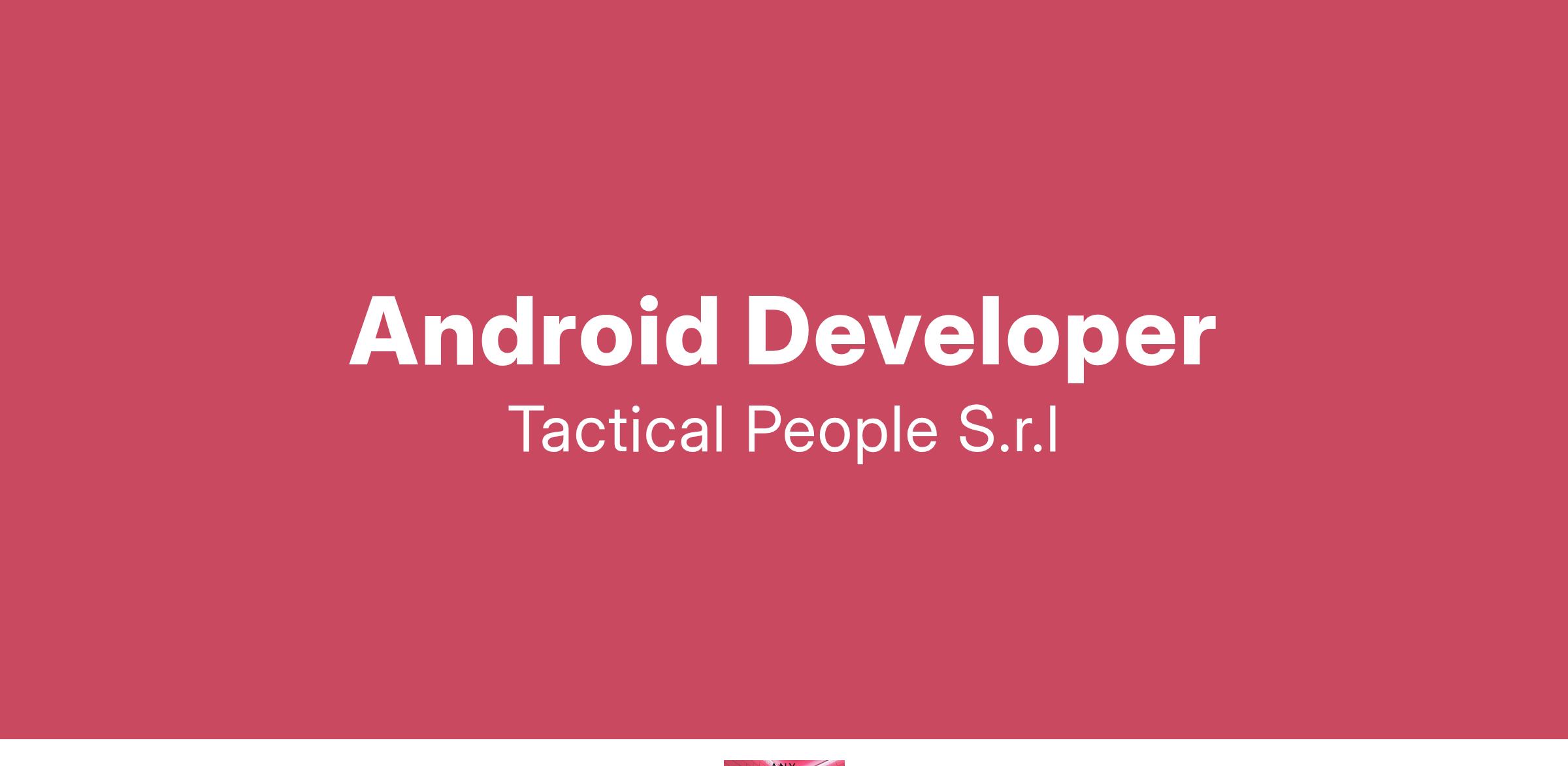 Unisciti a TACTICAL PEOPLE: Innovazione, Persone e Crescita nel Cuore della Digital Transformation Da oltre 20 anni, TACTICAL PEOPLE si posiziona come leader nel mercato ICT, guidando con passione e competenza i nostri clienti di medie e grandi dimensioni attraverso il dinamico percorso della digital transformation. La nostra mission è chiara: non solo abbracciare il cambiamento tecnologico, ma guidarlo, creando soluzioni all'avanguardia che plasmino il futuro digitale. In TACTICAL PEOPLE, crediamo fortemente nel mettere le persone al centro di ogni nostra iniziativa. Le persone sono il cuore pulsante della nostra azienda; il loro benessere, la loro crescita e il loro sviluppo sono la nostra priorità. Ci impegniamo a condividere le strategie aziendali con trasparenza e a fornire formazione e supporto a ogni livello, garantendo che ogni membro del team sia equipaggiato per eccellere e innovare. Stiamo cercando individui che condividano la nostra visione, che siano guidati dalla passione per la tecnologia e che desiderino essere protagonisti nella costruzione di un futuro digitale più luminoso. Se sei pronto a far parte di una squadra che valorizza il talento, incoraggia la crescita personale e professionale e lavora in prima linea nel settore della digital transformation, TACTICAL PEOPLE è il posto giusto per te. Posizione Aperta: Android Developer Sede: Remoto con possibilità di trasferta su Roma e/o Maranello Descrizione del ruolo: Stiamo ricercando un Senior Android Developer e un Middle Android Developer con comprovate competenze con il linguaggio Kotlin. Cosa offriamo: Inserimento immediato in una Tech Community giovane e dinamica. TACTICAL LEARNING HUB, con corsi di aggiornamento e formazione. Il presente annuncio è rivolto ad entrambi i sessi, ai sensi delle leggi 903/77 e 125/91, e a persone di tutte le età e tutte le nazionalità, ai sensi dei decreti legislativi 215/03 e 216/03. I curricula dovranno pervenire completi di dicitura che autorizza il trattamento dei propri dati: “Si autorizza al trattamento dei dati personali ai sensi del D. Lgs. 196/2003.