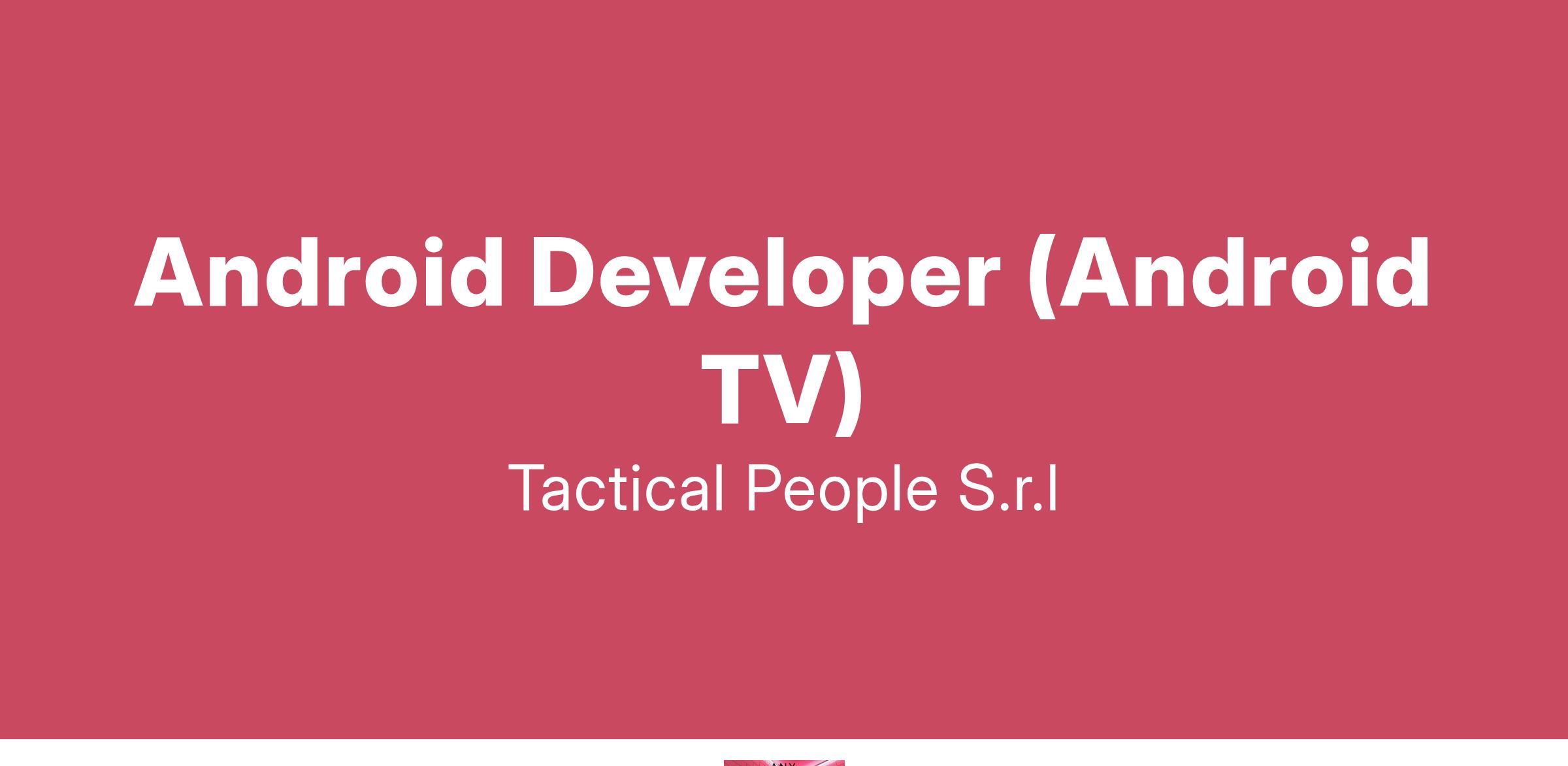 Unisciti a TACTICAL PEOPLE: Innovazione, Persone e Crescita nel Cuore della Digital Transformation Da oltre 20 anni, TACTICAL PEOPLE si posiziona come leader nel mercato ICT, guidando con passione e competenza i nostri clienti di medie e grandi dimensioni attraverso il dinamico percorso della digital transformation. La nostra mission è chiara: non solo abbracciare il cambiamento tecnologico, ma guidarlo, creando soluzioni all'avanguardia che plasmino il futuro digitale. In TACTICAL PEOPLE, crediamo fortemente nel mettere le persone al centro di ogni nostra iniziativa. Le persone sono il cuore pulsante della nostra azienda; il loro benessere, la loro crescita e il loro sviluppo sono la nostra priorità. Ci impegniamo a condividere le strategie aziendali con trasparenza e a fornire formazione e supporto a ogni livello, garantendo che ogni membro del team sia equipaggiato per eccellere e innovare. Stiamo cercando individui che condividano la nostra visione, che siano guidati dalla passione per la tecnologia e che desiderino essere protagonisti nella costruzione di un futuro digitale più luminoso. Se sei pronto a far parte di una squadra che valorizza il talento, incoraggia la crescita personale e professionale e lavora in prima linea nel settore della digital transformation, TACTICAL PEOPLE è il posto giusto per te. Posizione Aperta: Android Developer (Android TV) Sede: Torino – Ibrido: 80% in Presenza e 20% da remoto Descrizione del ruolo: Il candidato ideale deve avere almeno 2-3 anni di esperienza nello sviluppo Android, con una solida esperienza su piattaforme Android TV . Cosa offriamo: Inserimento immediato in una Tech Community giovane e dinamica. TACTICAL LEARNING HUB, con corsi di aggiornamento e formazione. Il presente annuncio è rivolto ad entrambi i sessi, ai sensi delle leggi 903/77 e 125/91, e a persone di tutte le età e tutte le nazionalità, ai sensi dei decreti legislativi 215/03 e 216/03. I curricula dovranno pervenire completi di dicitura che autorizza il trattamento dei propri dati: “Si autorizza al trattamento dei dati personali ai sensi del D. Lgs. 196/2003.