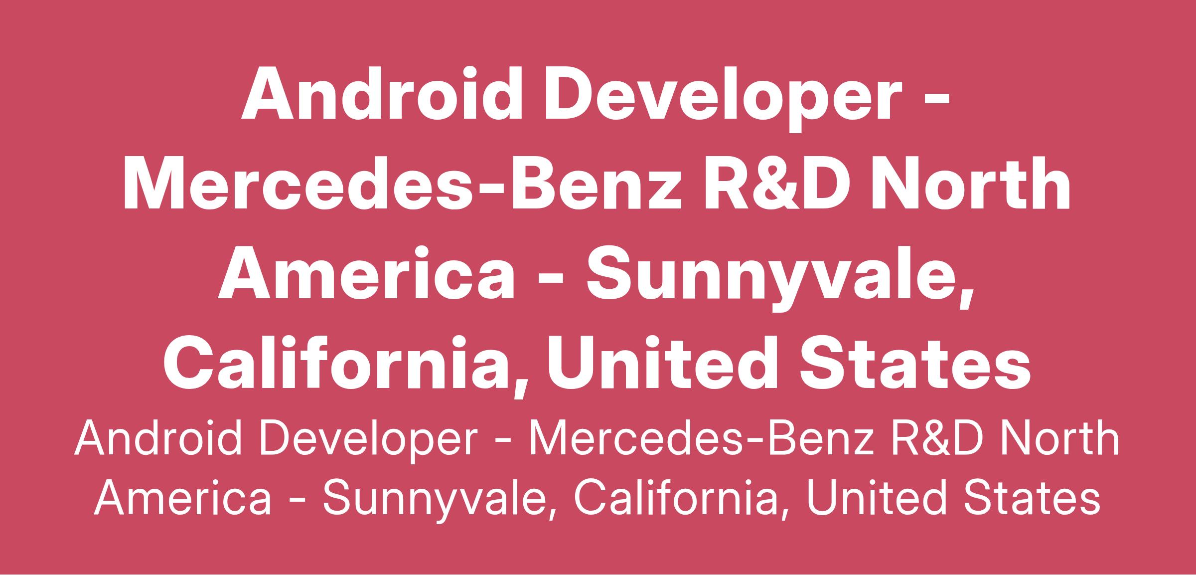Mercedes-Benz Research & Development North America, Inc. (MBRDNA) is seeking an Android Developer to join the US Experience team. This is a full-time, exempt position at the MBRDNA regional office in Long Beach, CA.