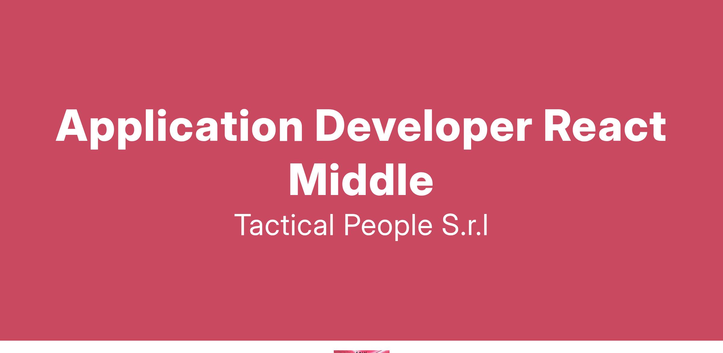 Unisciti a TACTICAL PEOPLE: Innovazione, Persone e Crescita nel Cuore della Digital Transformation Da oltre 20 anni, TACTICAL PEOPLE si posiziona come leader nel mercato ICT, guidando con passione e competenza i nostri clienti di medie e grandi dimensioni attraverso il dinamico percorso della digital transformation. La nostra mission è chiara: non solo abbracciare il cambiamento tecnologico, ma guidarlo, creando soluzioni all'avanguardia che plasmino il futuro digitale. In TACTICAL PEOPLE, crediamo fortemente nel mettere le persone al centro di ogni nostra iniziativa. Le persone sono il cuore pulsante della nostra azienda; il loro benessere, la loro crescita e il loro sviluppo sono la nostra priorità. Ci impegniamo a condividere le strategie aziendali con trasparenza e a fornire formazione e supporto a ogni livello, garantendo che ogni membro del team sia equipaggiato per eccellere e innovare. Stiamo cercando individui che condividano la nostra visione, che siano guidati dalla passione per la tecnologia e che desiderino essere protagonisti nella costruzione di un futuro digitale più luminoso. Se sei pronto a far parte di una squadra che valorizza il talento, incoraggia la crescita personale e professionale e lavora in prima linea nel settore della digital transformation, TACTICAL PEOPLE è il posto giusto per te. Posizione Aperta: Application Developer React Middle Sede: Napoli Descrizione del ruolo: il candidato ideale deve almeno 2-4 anni di esperienza nello sviluppo di applicazioni React. Cosa offriamo: Inserimento immediato in una Tech Community giovane e dinamica. TACTICAL LEARNING HUB, con corsi di aggiornamento e formazione. Il presente annuncio è rivolto ad entrambi i sessi, ai sensi delle leggi 903/77 e 125/91, e a persone di tutte le età e tutte le nazionalità, ai sensi dei decreti legislativi 215/03 e 216/03. I curricula dovranno pervenire completi di dicitura che autorizza il trattamento dei propri dati: “Si autorizza al trattamento dei dati personali ai sensi del D. Lgs. 196/2003.