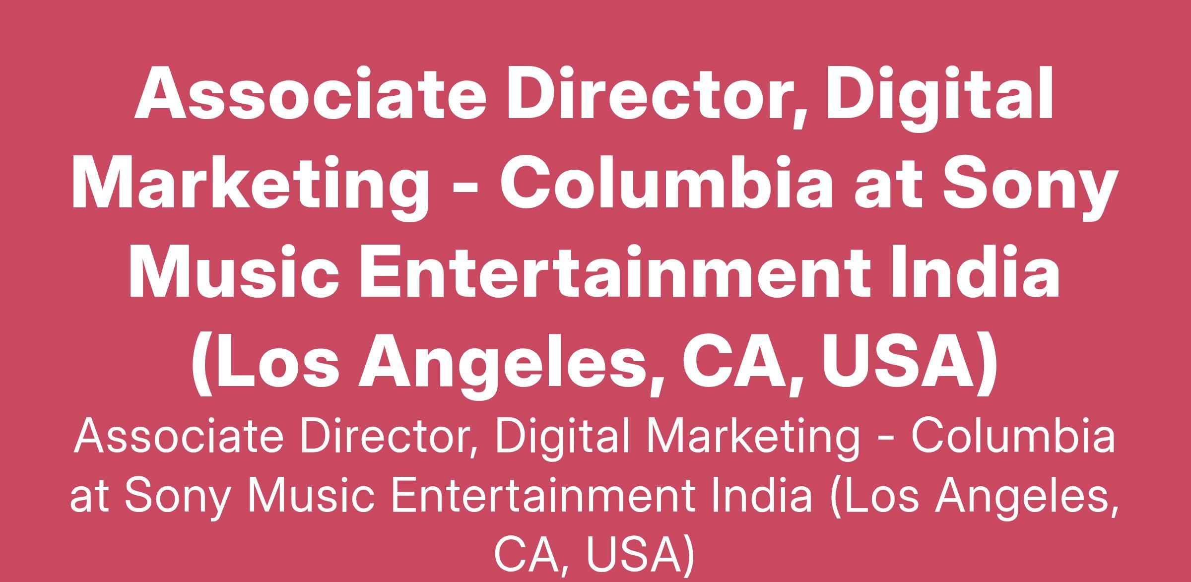 Associate Director, Digital Marketing - Columbia at Sony Music Entertainment India (Los Angeles, CA, USA)