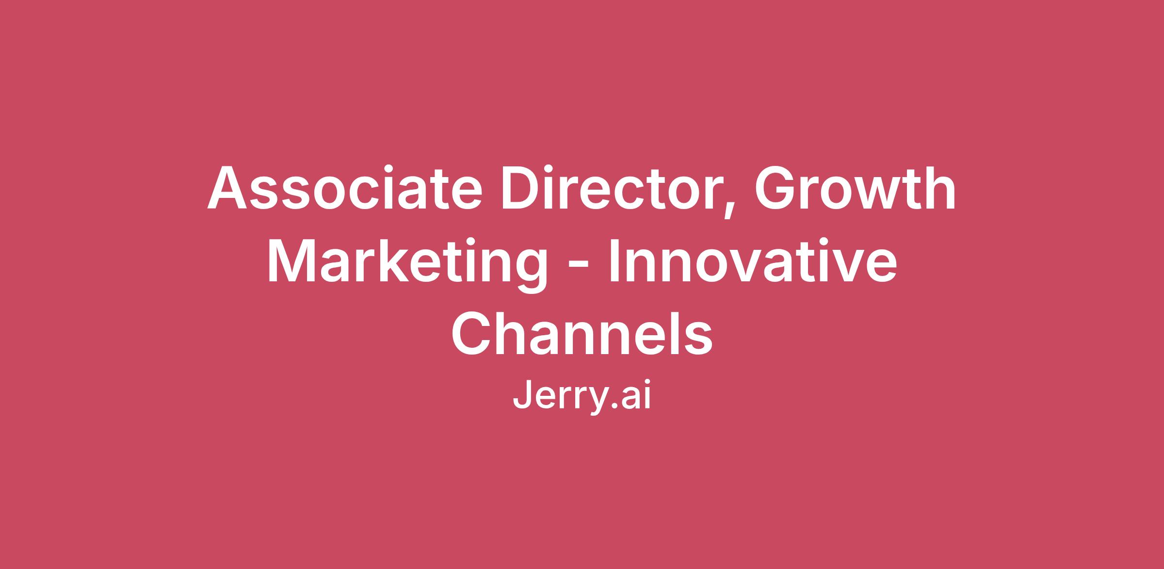 Why Jerry.aiJoin a profitable pre-IPO startup with capital, traction and runway ($240M funded | 60X revenue growth in 5 years | $2T market size)Work closely with brilliant leaders and teammates from companies like McKinsey, BCG, Bain, Nvidia, Better, Amazon, etc.Disrupt a massive market and take us to a $10B business in the next few yearsBe immersed in a talent-dense environment and greatly accelerate your career growthLaunch new marketing channels from 0 to 1, scale other existing channels from 1 to 100! About the opportunity:At Jerry.ai, we are redefining and radically improving how people manage owning a car, one of their most expensive and time-consuming assets. Backed by artificial intelligence and machine learning, Jerry.ai simplifies and automates owning and maintaining a car while providing personalized services for all car owners' needs. We spend every day innovating and improving our AI-powered app to provide the best possible experience for our customers. We are the #1 rated and most downloaded app in our category with a 4.7 star rating in the App Store. We have more than 5 million customers — and we’re just getting started.With significant progress across various aspects of our product, we are prioritizing customer acquisition and profitable growth as our top objectives for the coming years. Our growth team (product & marketing) is directly responsible for Jerry.ai’s most critical initiative - achieving high double-digit growth - by driving customer acquisition through strategic and innovative approaches.To achieve this, we're hiring an Associate Director, Growth Marketing - Innovative Channels to identify, launch, and scale new customer acquisition channels. This is a high-impact, high-autonomy role for someone who loves building: exploring uncharted channels — from insurance affiliates and direct mail to emerging platforms like AppLovin and Reddit — and turning early signals into scalable growth engines. You'll bring strong marketing fundamentals, sharp analytical instincts, and creative vision to find Jerry's next big growth levers.Critically, you'll also be at the forefront of a new frontier: pioneering how Jerry uses AI agents to transform the way we operate and scale marketing. This isn't a role that fits neatly into a box — it's an opportunity to shape the expansion roadmap, influence company strategy, and help define what modern growth marketing looks like.You will work directly with the VP of Growth and the executive team, with significant CEO visibility and real influence over where Jerry grows next. How you will make impact:Own end-to-end channel expansion: research, prioritize, launch, and iterate across a diverse mix of paid and partnership-based channels (e.g., affiliates, direct mail, social platforms, emerging ad networks)Shape the innovative channel roadmap — identifying the highest-potential opportunities and making the strategic case for where Jerry should invest nextApply strong marketing fundamentals — audience targeting, bidding strategies, creative development, and landing page optimization — across varied and novel channel contextsPioneer the adoption of AI agents in marketing operations: identify where AI can accelerate testing, automate workflows, and unlock capabilities that weren't previously possibleDesign and execute rigorous experiments: form hypotheses, define success metrics, run tests, interpret results, and scale what worksAnalyze performance across full-funnel metrics (CAC, LTV, ROAS, incrementality), identify trends, and translate data into clear strategic recommendations that influence resource allocation and company prioritiesPartner closely with product, data, and creative teams to build the infrastructure and assets that make new channels succeed Who you are:4+ years of experience in performance or growth marketing, with meaningful exposure across multiple channels (paid social, affiliates, direct mail, emerging platforms, or similar)Consulting background (ideally MBB or equivalent) preferred, with demonstrated ability to structure complex problems, prioritize ruthlessly, and communicate clearly to senior stakeholdersStrong foundational understanding of core marketing levers — bidding, targeting, creative, and landing page optimization — and the ability to apply them across diverse and unfamiliar contextsStrong quantitative analytical ability working with full-funnel metrics (CAC, LTV, ROAS, incrementality) and a knack for storytelling through dataGenuine creative acumen — you have a point of view on what makes compelling creative and can partner effectively with designers and copywriters to bring ideas to lifeExcited about — and ideally experienced with — applying AI tools and agents to accelerate marketing work, not just as a productivity hack but as a strategic capabilityCuriosity and resourcefulness: energized by channels and problems you haven't fully solved before, and know how to get up to speed fastThrives in ambiguous, fast-paced environments with an ownership mentality — you are not satisfied with "good enough"While we appreciate your interest and application, only applicants under consideration will be contacted.Jerry.ai is proud to be an Equal Employment Opportunity employer. We prohibit discrimination based on race, religion, color, national origin, sex, pregnancy, reproductive health decisions or related medical conditions, sexual orientation, gender identity, gender expression, age, veteran status, disability, genetic information, or other characteristics protected by applicable local, state or federal laws. Jerry.ai is committed to providing reasonable accommodations for individuals with disabilities in our job application process. If you need assistance or an accommodation due to a disability, please contact us at recruiting@jerry.aiThe successful candidate’s starting pay will fall within the pay range listed on this job posting, determined based on job-related factors including, but not