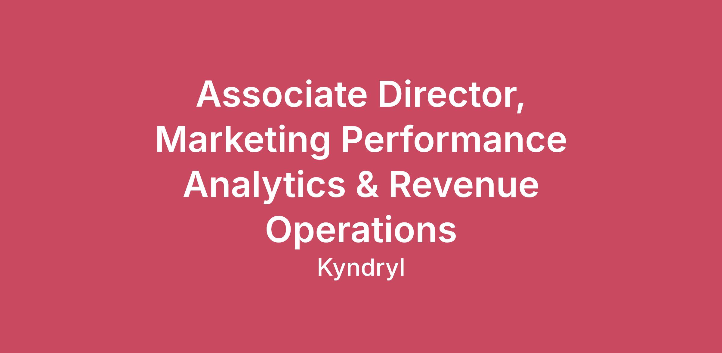 Who We AreAt Kyndryl, we design, build, manage and modernize the mission-critical technology systems that the world depends on every day. So why work at Kyndryl? We are always moving forward – always pushing ourselves to go further in our efforts to build a more equitable, inclusive world for our employees, our customers and our communities.The RoleThe RoleThe Marketing Analytics and Revenue Operations Associate Director is a strategic analytical leader responsible for driving insight generation across our B2B marketing organization. This role helps the business understand growth through the lens of marketing channels and identifies how to accelerate that growth by analyzing performance across channels, audiences, and the end‑to‑end marketing funnel.In this role, you will compare performance across email, events, paid media, digital programs, and other B2B marketing channels. You will identify where the marketing organization should invest, optimize, or shift spend, and you will provide regular insights and recommendations to channel owners to improve efficiency and ROI.The Marketing Associate Director will lead a team of 1–2 managers (who may themselves oversee analysts) and will work directly with marketing teams to deliver recommendations, build dashboards, automate insights, and support data‑driven decision‑making across the organization. This includes automating reporting, surfacing actionable insights for marketing and sales stakeholders, and ensuring data accuracy, consistency, and usability across CRM systems, marketing platforms, and data warehouses. This will also require deep partnership with operations and engineering teams to improve data flows, data models, and data quality.In this role, you will be responsible for deep expertise with our marketing platforms, reviewing APIs and data conformance, defining metadata strategies, and simplifying technical outputs into clear narratives for marketing teams. You will lead analytics projects from start to finish, including developing attribution systems, building segmentation models, and evaluating performance across key marketing channels.You will shift seamlessly between business problems—from developing segmentation frameworks that support ABM, to optimizing event strategy, digital marketing growth, content performance, and integrated marketing/sales strategies. You will leverage LTV and cohort models to guide investment decisions and prioritization. You will diagnose funnel performance, identify bottlenecks, and recommend actions that improve conversion and revenue impact. You will present findings and recommendations directly to marketing leadership, senior stakeholders, and the Chief Marketing Officer of Kyndryl. This role will report directly to the Vice President of Marketing Analytics and Revenue Operations at Kyndryl.Key Competencies: Strong analytical and quantitative problem‑solvingAbility to work autonomously and lead medium‑ to large‑scale projects end‑to‑endProvide thought leadership to senior leads, including the Chief Marketing Officer of KyndrylSkilled at translating insights into actionable business recommendationsStrong collaboration and relationship‑building across marketing, sales, and operationsHigh attention to data quality, structure, and consistencyCuriosity, initiative, and deep commitment to driving business growthExecutive‑ready communication and data storytelling, including presentations to the CMOKyndryl currently does not require employees to be fully vaccinated against COVID-19, however, if you are hired to work at a client, customer, or partner location, you may be required to show proof of vaccination to align with their respective COVID-19 vaccination policies. Those who believe they are eligible may apply for a medical or religious accommodation prior to the start of employment.Who You AreRequired Skills:Bachelor’s or Master’s degree in Analytics, Data Science, Business, Economics, or equivalent professional portfolio8+ years of experience in B2B marketing analytics, business intelligence, or revenue analytics2+ experience in leading a program with a team and developing talent =Proficiency in SQL and Power BI (required)Experience with CRM, Marketing, and Sales Platforms (e.g., Marketo, CJA, Atlas, Salesforce)Strong understanding of multi‑touch attribution, marketing analytics, B2B funnels, and revenue dynamicsDemonstrated ability to manage and mentor managers and analytical talentExcellent communication and data storytelling skills; able to simplify complexity for diverse audiences, including senior executivesThe compensation range for the position in the U.S. is -$124,920 to $237,480 based on a full-time schedule. Your actual compensation may vary depending on your geography, job-related skills and experience. For part time roles, the compensation will be adjusted appropriately. The pay or salary range will not be below any applicable state, city or local minimum wage requirement.There is a different applicable compensation range for the following work locations:California (San Francisco Bay Area): $149,880 to $284,880 California (All Other): $137,400 to $261,120 Colorado: $124,920 to $237,480 Massachusetts: $124,920 to $261,120 New York City: $149,880 to $284,880 Washington: $137,400 to $261,120 Washington DC: $137,400 to $261,120 This position will be eligible for Kyndryl’s discretionary annual bonus program, based on performance and subject to the terms of Kyndryl’s applicable plans. You may also receive a comprehensive benefits package which includes medical and dental coverage, disability, retirement benefits, paid leave, and paid time off. Note: If this is a sales commission eligible role, you will be eligible to participate in a sales commission plan in lieu of the annual discretionary bonus program.Applications will be accepted on a rolling basis.Being YouDiversity is a whole lot more than what we look like or where we come from, it’s how we think 