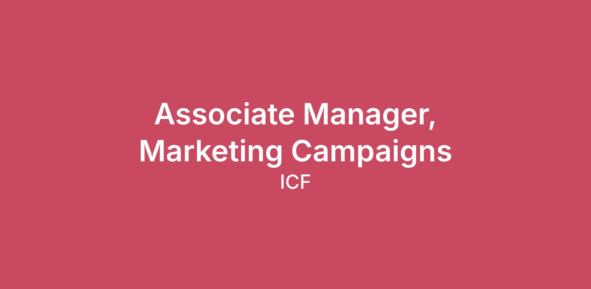 The Company At ICF Next, we are fearless in finding new ways to solve problems, relentless in delivering results for our clients, and committed to making a positive impact. We’re an award-winning agency of mission-driven creatives, communicators, strategists, and technologists. We’re hiring an Associate Manager, Marketing Campaigns to support workforce-focused initiatives within the U.S. Department of Labor. This role will manage outreach and awareness activities designed to engage industry and workforce audiences in support of federal programs. The Team You’ll join a collaborative team of communications strategists, researchers, media specialists, and creative professionals supporting federal clients. Our team develops and implements data-informed outreach strategies that help agencies expand reach, strengthen engagement, and achieve program goals. In this role, you will manage a team of communications specialists across research, creative, and media functions, ensuring coordination across campaign activities and alignment with client priorities. The Work You will manage integrated communications and outreach activities from planning through execution and reporting. This includes applying market research and program data to inform campaign plans, coordinating multi-channel implementation across earned, owned, and paid media, and supporting strategic advertising placement. The role requires strong organizational and project management skills, attention to detail, and the ability to manage multiple concurrent initiatives in a fast-paced environment. You will monitor campaign performance, contribute to progress reporting, and recommend adjustments to optimize outreach effectiveness. Key Responsibilities: Manage integrated communications and outreach activities in support of Department of Labor initiatives. Support the development and implementation of awareness and outreach campaign strategies based on market research and data analysis. Coordinate multi-channel marketing efforts across earned, owned, paid, and PSA platforms. Oversee strategic advertising placement and media booking to optimize message reach. Collaborate with industry stakeholders and workforce partners to expand targeted outreach efforts. Manage multiple outreach projects simultaneously while ensuring high-quality deliverables and adherence to deadlines. Supervise communications specialists and provide guidance across research, creative, and media activities. Contribute to regular campaign performance reporting and recommend improvements to enhance effectiveness. Required Qualifications: Bachelor’s degree in marketing, communications, data analysis, or a similar field Ability to obtain and maintain a Public Trust clearance. Demonstrated experience managing communications or outreach programs. Professional SkillsExperience conducting or applying market research and translating insights into actionable campaign plans. Experience managing integrated marketing efforts across earned, owned, and paid channels. Experience overseeing advertising placement or media coordination. Proven ability to manage multiple projects and meet tight deadlines in a fast-paced environment. Experience working with industry stakeholders or partners in support of government programs. Strong written and verbal communication skills. Preferred Qualifications: Experience supporting workforce development or employee-focused programs. Experience managing communications specialists or cross-functional project teams. Experience developing campaign reports and presenting findings to clients. Experience supporting Department of Labor or other federal agencies is a plus. Job Location: This position is remote but requires you to be located in or near the Washington, D.C. Metropolitan area (DMV) to attend occasional onsite client meetings. This position requires that the job be performed in the United States. If you accept this position, you should note that ICF does monitor employee work locations and blocks access from foreign locations/foreign IP addresses, and also prohibits personal VPN connections. Working at ICFICF is a global advisory and technology services provider, but we’re not your typical consultants. We combine unmatched expertise with cutting-edge technology to help clients solve their most complex challenges, navigate change, and shape the future.We can only solve the world's toughest challenges by building a workplace that allows everyone to thrive. We are an equal opportunity employer. Together, our employees are empowered to share their expertise and collaborate with others to achieve personal and professional goals. For more information, please read our EEO policy.We will consider for employment qualified applicants with arrest and conviction records. Reasonable Accommodations are available, including, but not limited to, for disabled veterans, individuals with disabilities, and individuals with sincerely held religious beliefs, in all phases of the application and employment process. To request an accommodation, please email Candidateaccommodation@icf.com and we will be happy to assist. All information you provide will be kept confidential and will be used only to the extent required to provide needed reasonable accommodations. Read more about workplace discrimination rights or our benefit offerings which are included in the Transparency in (Benefits) Coverage Act. Candidate AI Usage PolicyAt ICF, we are committed to ensuring a fair interview process for all candidates based on their own skills and knowledge. As part of this commitment, the use of artificial intelligence (AI) tools to generate or assist with responses during interviews (whether in-person or virtual) is not permitted. This policy is in place to maintain the integrity and authenticity of the interview process. However, we understand that some candidates may require accommodation that involves the use of AI. If such an accommodation is needed, candidates are instructe