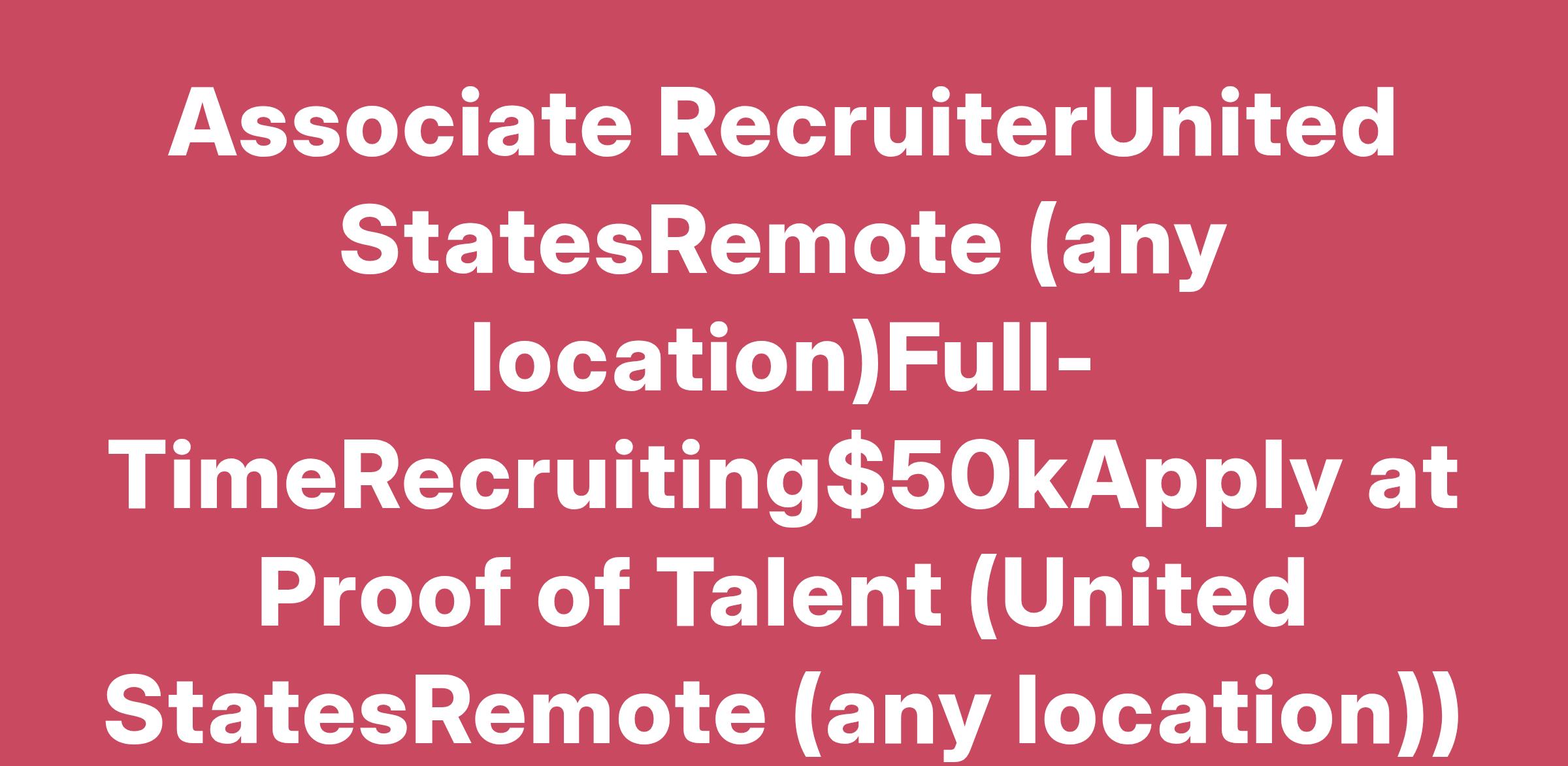 Associate RecruiterUnited StatesRemote (any location)Full-TimeRecruiting$50kApply at Proof of Talent (United StatesRemote (any location))