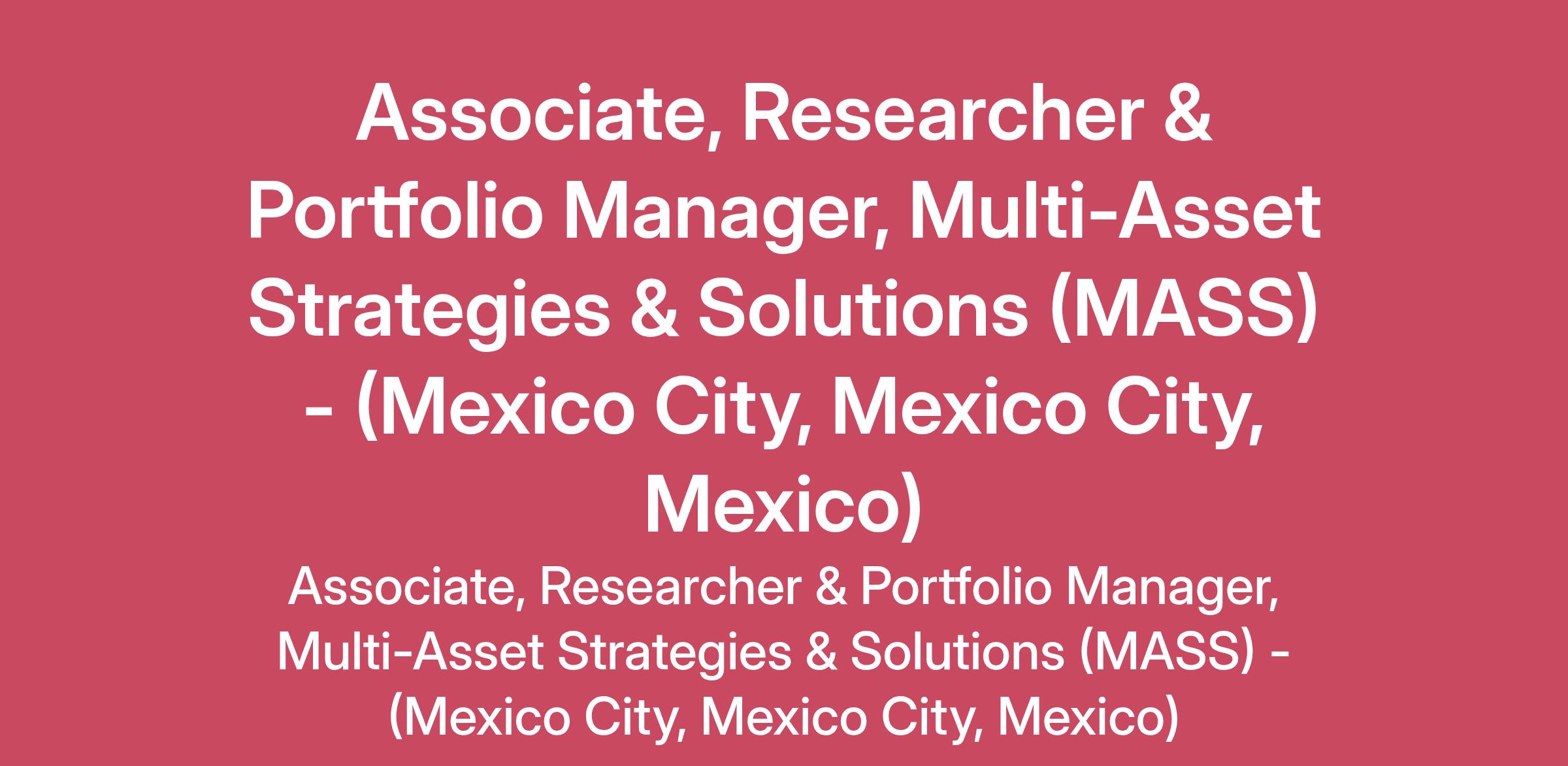 BlackRock is seeking a quantitative researcher / portfolio manager to join the Global MASS business; this role will be based in Mexico City. The role will involve research into portfolio construction techniques, long-term return forecasting, strategy and product development, market analysis, portfolio management, and client support in the global Solutions businesses. Success in this position will require strong analytical and quantitative skills, evidenced by experience in investments or financial markets, with the ideal candidate having experience with multi-asset investing. In addition, the candidate should be willing to collaborate effectively with a distributed team of researchers and portfolio managers, both within the MASS team and across the wider BlackRock community, and he or she should possess strong communication skills.