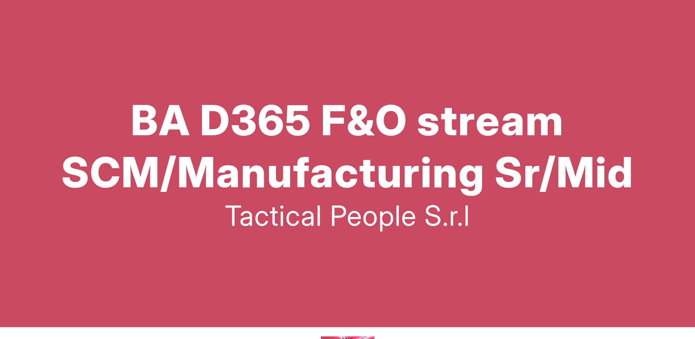 Unisciti a TACTICAL PEOPLE: Innovazione, Persone e Crescita nel Cuore della Digital Transformation Da oltre 20 anni, TACTICAL PEOPLE si posiziona come leader nel mercato ICT, guidando con passione e competenza i nostri clienti di medie e grandi dimensioni attraverso il dinamico percorso della digital transformation. La nostra mission è chiara: non solo abbracciare il cambiamento tecnologico, ma guidarlo, creando soluzioni all'avanguardia che plasmino il futuro digitale. In TACTICAL PEOPLE, crediamo fortemente nel mettere le persone al centro di ogni nostra iniziativa. Le persone sono il cuore pulsante della nostra azienda; il loro benessere, la loro crescita e il loro sviluppo sono la nostra priorità. Ci impegniamo a condividere le strategie aziendali con trasparenza e a fornire formazione e supporto a ogni livello, garantendo che ogni membro del team sia equipaggiato per eccellere e innovare. Stiamo cercando individui che condividano la nostra visione, che siano guidati dalla passione per la tecnologia e che desiderino essere protagonisti nella costruzione di un futuro digitale più luminoso. Se sei pronto a far parte di una squadra che valorizza il talento, incoraggia la crescita personale e professionale e lavora in prima linea nel settore della digital transformation, TACTICAL PEOPLE è il posto giusto per te. Posizione Aperta: Business Analyst D365 F&O stream SCM/Manufacturing Senior/Middle Sede: Remoto Descrizione del ruolo: Il candidato ideale deve avere esperienza minimo 4 anni su Dynamics 365 F&O in area Supply Chain e Manufacturing. Cosa offriamo: Inserimento immediato in una Tech Community giovane e dinamica. TACTICAL LEARNING HUB, con corsi di aggiornamento e formazione. Il presente annuncio è rivolto ad entrambi i sessi, ai sensi delle leggi 903/77 e 125/91, e a persone di tutte le età e tutte le nazionalità, ai sensi dei decreti legislativi 215/03 e 216/03. I curricula dovranno pervenire completi di dicitura che autorizza il trattamento dei propri dati: “Si autorizza al trattamento dei dati personali ai sensi del D. Lgs. 196/2003.