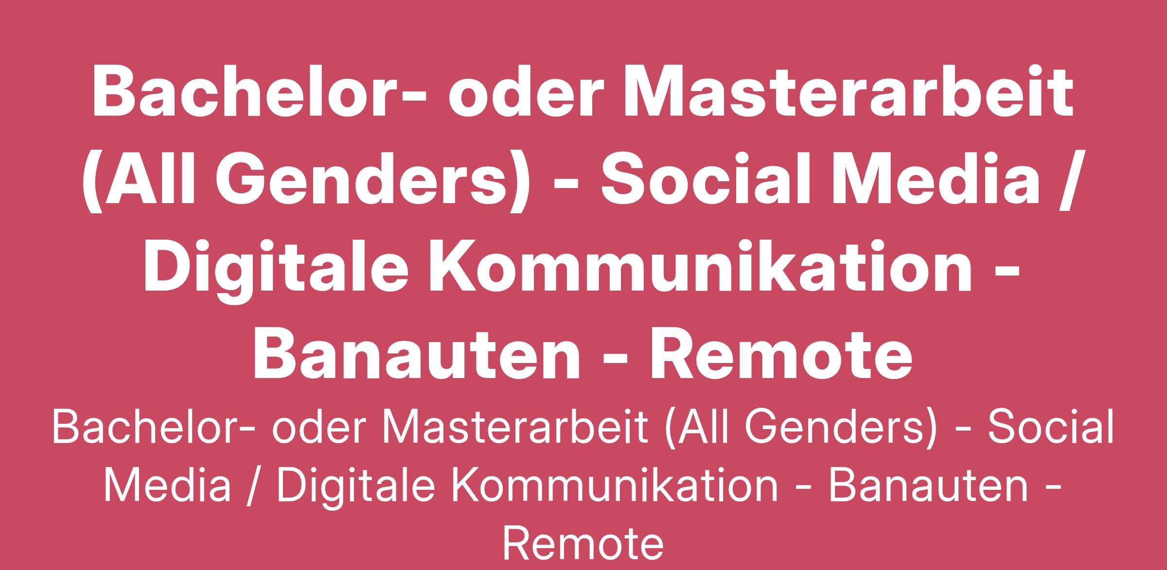Hi! Du bist in den letzten Zügen deines Bachelor- oder Master-Studiums und möchtest gerne eine praxisnahe Arbeit in einem Unternehmen schreiben? Du denkst digital und liebst Kommunikation? Dann bist du bei uns genau richtig! Komm mit an Bord, werde Teil der Banauten-Crew und schreibe bei uns deine Abschlussarbeit.