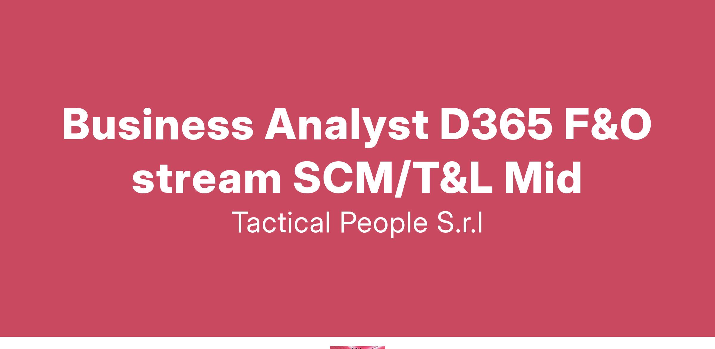 Unisciti a TACTICAL PEOPLE: Innovazione, Persone e Crescita nel Cuore della Digital Transformation Da oltre 20 anni, TACTICAL PEOPLE si posiziona come leader nel mercato ICT, guidando con passione e competenza i nostri clienti di medie e grandi dimensioni attraverso il dinamico percorso della digital transformation. La nostra mission è chiara: non solo abbracciare il cambiamento tecnologico, ma guidarlo, creando soluzioni all'avanguardia che plasmino il futuro digitale. In TACTICAL PEOPLE, crediamo fortemente nel mettere le persone al centro di ogni nostra iniziativa. Le persone sono il cuore pulsante della nostra azienda; il loro benessere, la loro crescita e il loro sviluppo sono la nostra priorità. Ci impegniamo a condividere le strategie aziendali con trasparenza e a fornire formazione e supporto a ogni livello, garantendo che ogni membro del team sia equipaggiato per eccellere e innovare. Stiamo cercando individui che condividano la nostra visione, che siano guidati dalla passione per la tecnologia e che desiderino essere protagonisti nella costruzione di un futuro digitale più luminoso. Se sei pronto a far parte di una squadra che valorizza il talento, incoraggia la crescita personale e professionale e lavora in prima linea nel settore della digital transformation, TACTICAL PEOPLE è il posto giusto per te. Posizione Aperta: Business Analyst D365 F&O stream SCM/T&L liv. Middle Sede: Remoto Descrizione del ruolo: Il candidato ideale deve almeno 4 anni di esperienza su Dynamics 365 F&O nell’area Supply Chain, con particolare focus su Trade & Logistics. Cosa offriamo: Inserimento immediato in una Tech Community giovane e dinamica. TACTICAL LEARNING HUB, con corsi di aggiornamento e formazione. Il presente annuncio è rivolto ad entrambi i sessi, ai sensi delle leggi 903/77 e 125/91, e a persone di tutte le età e tutte le nazionalità, ai sensi dei decreti legislativi 215/03 e 216/03. I curricula dovranno pervenire completi di dicitura che autorizza il trattamento dei propri dati: “Si autorizza al trattamento dei dati personali ai sensi del D. Lgs. 196/2003.