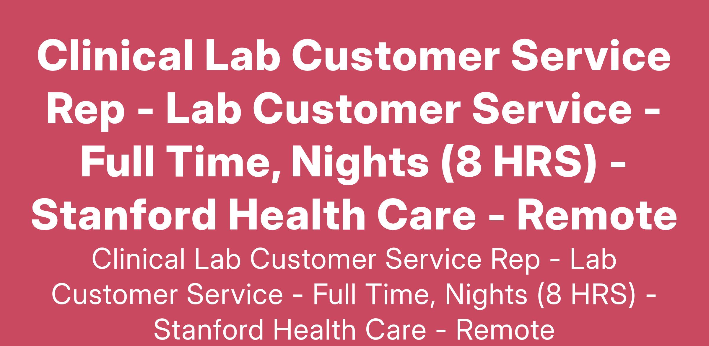 This is a Stanford Health Care job.A Brief OverviewThe Clinical Customer Service Representative, functions as a member of the Anatomic Pathology and Clinical Laboratory team and reports directly to the Clinical Laboratory Customer Service Supervisor. Under general supervision and according to established procedures, reports critical patient results to RNs/MDs, promptly answers telephone inquiries related to the Hospital and the Clinical Laboratory, retrieves, sorts and files paperwork, prints requisitions, and performs additional laboratory customer service tasks and activities.