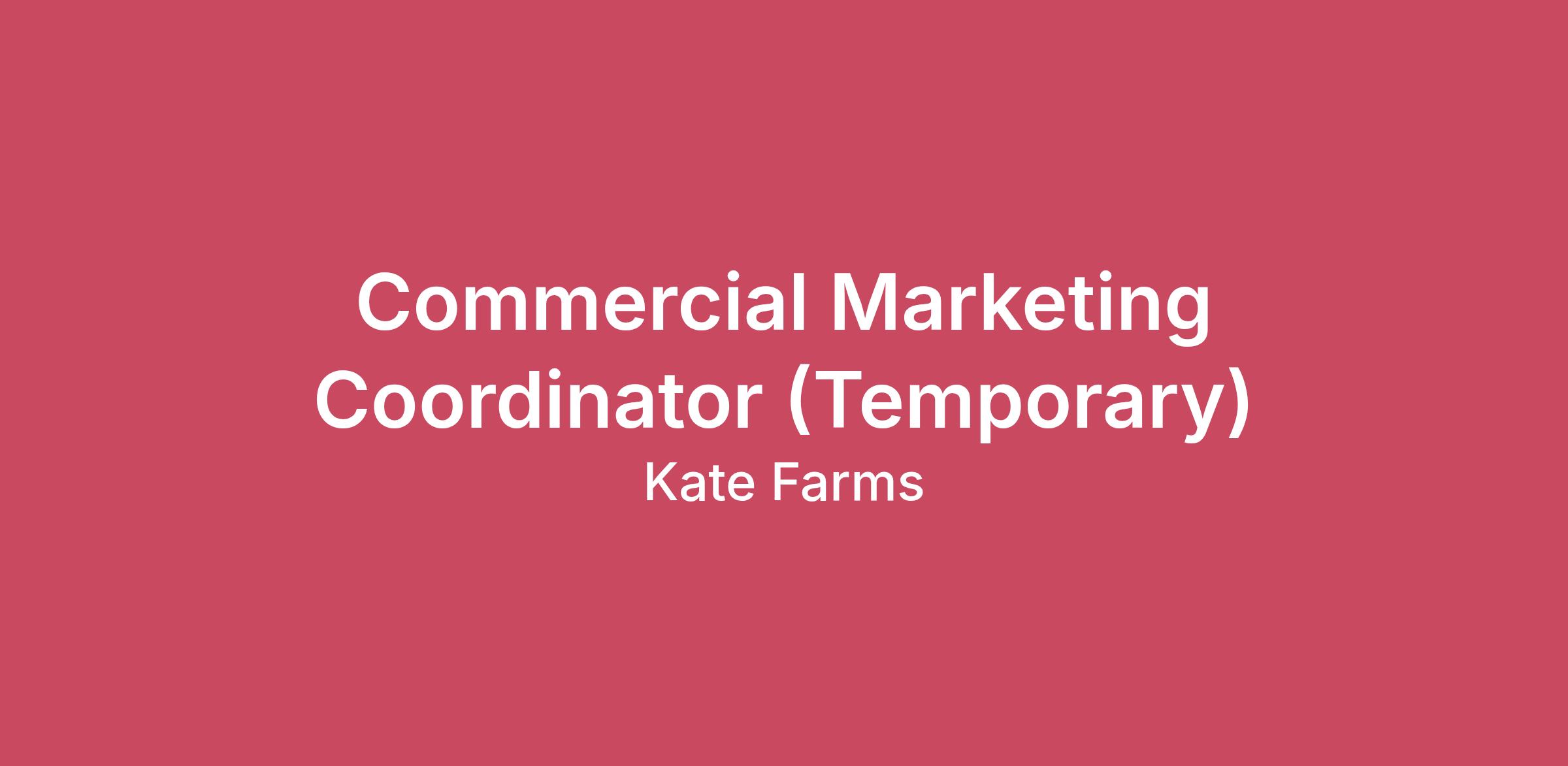 ABOUT KATE FARMS Kate Farms is a company with heart. Our company was founded on the belief that good nutrition leads to good health, and good health opens the door to endless possibilities. That’s why our mission is to make nutrition the cornerstone of healthcare so people can live their best lives. We are a medical food company that makes complete nutrition formulas for people who have a medical need for liquid nutrition. Kate Farms works to be the place where a diverse mix of talented individuals want to come, stay, and do their best work. Ensuring a diverse and inclusive workplace where we learn from each other is at the core of Kate Farms’ values. We are an equal-opportunity employer and fully focused on equality; we believe deeply in diversity of race, gender, sexual orientation, religion, ethnicity, national origin, and all the other fascinating characteristics that make us different. We invite you to do the best work of your life with us at Kate Farms. POSITION OVERVIEW The Commercial Marketing Coordinator will be a key member of the Kate Farms Commercial Marketing team, helping bring our mission to life across culture, healthcare, and everyday experiences. This role supports brand campaigns, partnerships, and activations - ensuring ideas move smoothly from concept to execution. You’ll help keep the blended strategy and portfolio positioning consistent and impactful by managing timelines, tracking deliverables, and connecting teams.Highly collaborative, this position works closely with the Brand, Performance, Sales, Customer Care, and brand partner teams to deliver seamless brand programs and experiences. It’s an excellent opportunity for someone detail-oriented, organized, and eager to grow in a mission-driven company - while energized by managing multiple initiatives, brand experience, and culture. If building a portfolio that drives both heart and business impact excites you, this role is for you. This position is a fully remote contract role through December 31, 2026. No travel is expected.WHAT YOU WILL DO Coordinate day-to-day execution of blended portfolio strategic roadmap - marketing projects, partnerships, campaigns, and communications—helping bring the blended portfolio story to life in consistent, compelling ways.Manage timelines, deliverables, and communication between internal teams and external agencies or vendors to keep projects on track and align with blended portfolio standards.Develop, create, and/or support the creation and distribution of marketing collateral (print, digital, social, presentations, sales materials, etc.), ensuring accuracy and brand consistency across every touchpoint.Collaborate with the digital team on email, web, and social initiatives, including content scheduling and performance monitoring—ensuring the blended portfolio shows up in ways that feel both on-brand and culturally relevant.Support the planning, logistics, and execution of partnerships, sponsorships, research, and activations, both virtual and in person, to create memorable and mission-aligned experiences. Conduct or support market research and competitive analysis to identify trends, cultural moments, and opportunities to differentiate the blended portfolio and connect authentically with our consumer.Provide administrative support to the commercial marketing team, including budget tracking, vendor payments, invoice processing, vendor coordination, and project management. WE ARE LOOKING FOR SOMEONE WITH2–3 years of experience in commercial marketing, brand management, or a related field (internship experience included).A passion for brand marketing and an interest in healthcare, wellness, and/or mission-driven organizations.Strong organizational skills with the ability to manage multiple projects and deadlines.Excellent written and verbal communication skills, with strong attention to detail.A collaborative and adaptable mindset, comfortable working across departments in a fast-paced environment.Familiarity with project management tools is a plus (Wrike, Asana, Monday.com). Analytical curiosity and comfort with tracking metrics and reporting results.A strong commitment to company mission and values.Capability to work independently and collaboratively in a fast-paced, dynamic environment.The ability to respectfully share and accept feedback willingly from all levels of the organization.PHYSICAL DEMANDS The physical demands described here are representative of those that must be met by the employee to successfully perform the essential functions of this job. Reasonable accommodations may be made to enable individuals with disabilities to perform essential functions.Effectively handle lifting of various objects weighing up to 12 pounds.While performing the essential functions of the job, the employee will be required to bend, stoop, kneel, reach, and climb stairs.Possess the ability to sit at a computer for extended periods of time. WORK ENVIRONMENT The work environment characteristics described here are representative of those an employee encounters while performing the essential functions of the job. Reasonable accommodations may be made to enable individuals with disabilities to perform essential functions. This position will work in a home/office environment with occasional trips to the corporate office or other meeting locations. No travel is expected. The typical starting salary range for new hires in this role is listed below. This range represents the lowest to highest salary range we reasonably and in good faith believe we would pay for this role at the time of this posting. We may ultimately pay more or less than the posted range, and the range may be modified in the future. Please note that base pay offered may vary depending on factors including your geographic location, job-related knowledge, skills, and experience.If hired, employee will be in an “at-will position” and the Company reserves the right to modify base salary (as well as any other discret