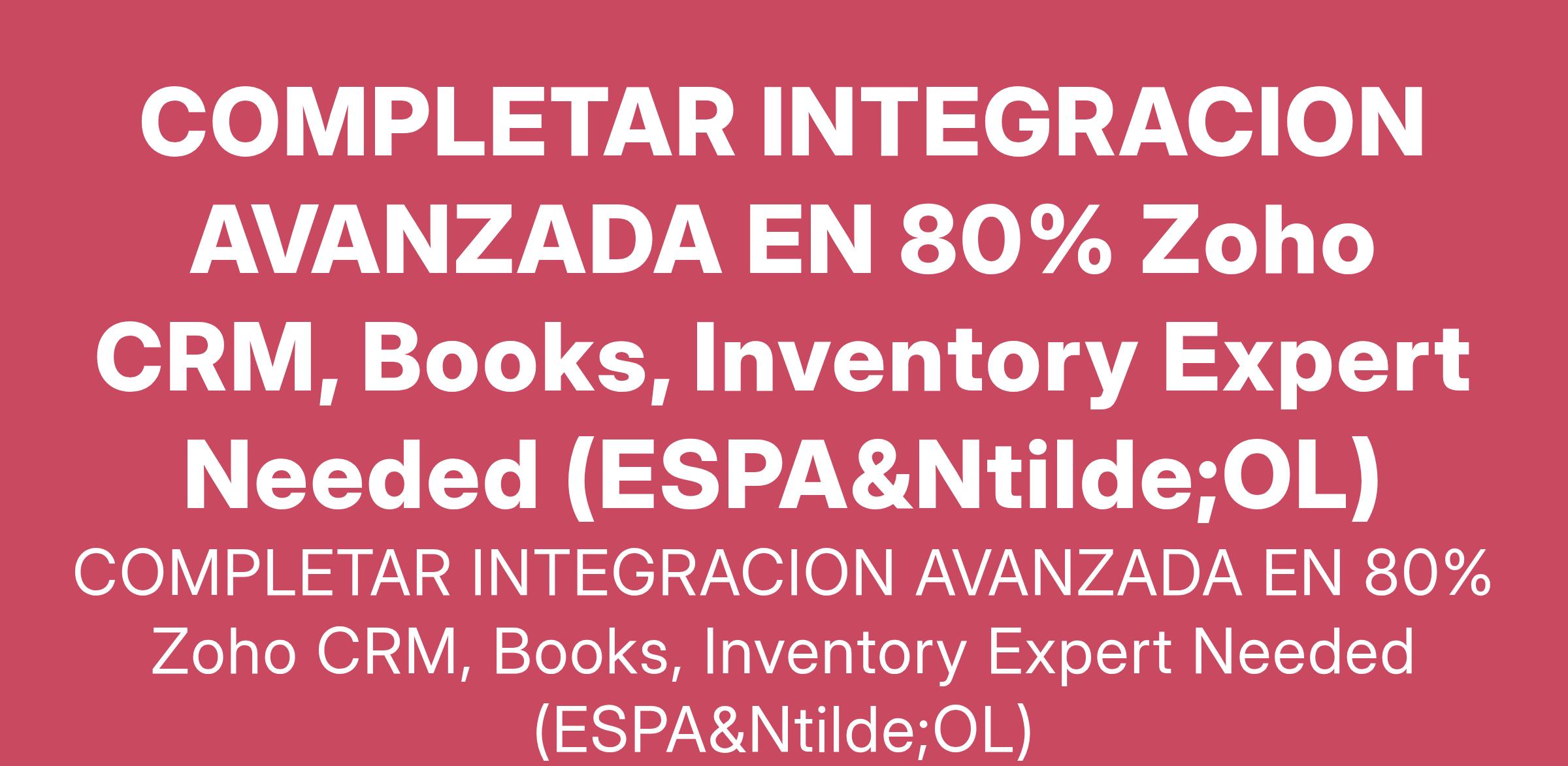 Estoy buscando un experto en Zoho para integrar Zoho CRM, Zoho Books, Inventory. La integración debe lograr los siguientes objetivos: • Procesos de ventas: automatice el seguimiento de clientes potenciales,... (Budget: $250 - $750 USD, Jobs: CRM, Excel, Software Testing, Zoho)