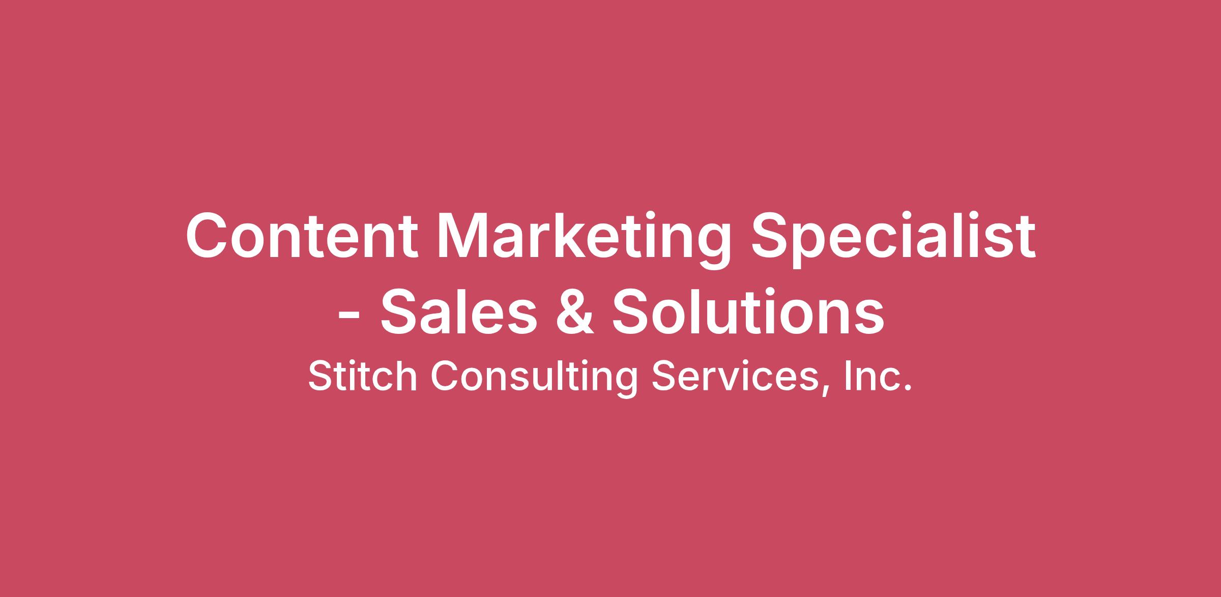 Stitch is the global leader in helping brands drive CRM performance through Braze and Databricks. We work with Fortune 1000 brands to design and execute martech-driven solutions and lifecycle marketing strategies that drive meaningful outcomes—producing award-winning work for brands like Taco Bell and e.l.f. cosmetics. Our fast-growing team spans the US, UK, and Canada.We’re actively building the best customer relationship marketing (CRM) consultancy in the world. Not the biggest—the best. We’re looking for teammates who are energized by this challenge.Who You AreFirst and foremost, you’re motivated by impact. To be the best CRM consultancy in the world, we have to be motivated by performance—both in how our work drives outcomes for our customers, and for how our work drives outcomes for Stitch.This means you’re not content with the status quo. You’re always looking towards what’s next and seeking opportunities to grow yourself, grow our customers, and grow Stitch. You have relentless standards and uphold them unapologetically. You move nimbly, take ownership, drive things forward, and make the people around you better. If this sounds like you, you will thrive here.About This RoleAt Stitch, we believe the next generation of marketing won’t be powered by more campaigns — it will be powered by better thinking, smarter systems, and teams that know how to turn complexity into clarity.The Content Marketing Specialist – Sales & Solutions will play a critical role in bringing that vision to life.This person is responsible for transforming Stitch’s expertise — from real customer work to emerging solutions and new ways of operating — into clear, compelling narratives that drive market understanding, build trust, and accelerate pipeline. They won’t just create content; they’ll help define how Stitch shows up in the market.Working across marketing, sales, and delivery, this role sits at the intersection of insight and execution — translating complex ideas into content that’s not only engaging, but usable. Content that sales teams can act on. Content that customers learn from. Content that moves deals forward.This is a hands-on role for someone who wants to do more than “write content.” You’ll shape how our solutions are understood, how our POV shows up in the world, and how we scale what we know across every channel.The ideal candidate is a fast learner with strong instincts, someone who asks sharp questions, connects dots quickly, and thrives in ambiguity. They are equal parts storyteller and operator — able to zoom out to shape a narrative, and zoom in to ship high-quality work quickly.This role is part of the Stitch marketing team and reports to the Solution Marketing Lead.What You’ll DoWork closely with SMEs to turn real insights and experience into branded contentPartner with delivery, solutions, sales, and alliances teams to identify strong customer stories, proof points, and emerging themesTranslate technical concepts and implementation details into clear, engaging storytelling for marketers, partners, and business stakeholdersPackage customer success into reusable assets across the website, campaigns, sales collateral, and partner channelsCreate multi-media content across channelsProduce content across multiple formats, including written, visual, and video — such as blog posts, customer stories, solution overviews, sales enablement assets, presentations, short-form videos, tutorials, and partner-facing materialsSupport video content creation end-to-end, including ideation, scripting, light editing, clipping, and repurposing for different channelsAdapt content for different audiences and stages of the funnel, ensuring it’s both compelling and usableSupport solution marketing and sales enablementCollaborate with the Solution Marketing Lead and sales to develop content that supports active sales cycles, including solution overviews, competitive insights, and pitch-ready materialsWork alongside sales operations to ensure enablement content is organized, accessible, and easy to activateHelp evolve solution marketing assets as offerings mature and new solutions are introducedManage content projects and workflowsOwn and manage your content workload from intake through execution — balancing speed, quality, and prioritiesCoordinate with internal subject matter experts to gather input, manage timelines, and move content projects forward efficientlySupport the marketing content calendar by executing against priority themes and business needsProactively identify gaps, blockers, or opportunities to improve content processes and outputWhat We’re Looking ForStrong writing and storytelling skills across multiple content formats — this role goes beyond writing and includes video and visual contentComfort learning and translating technical concepts into clear, audience-friendly messagingStrong project management and organizational skills, with the ability to manage multiple projects and stakeholders at onceA proactive, collaborative mindset — willing to jump in, ask questions, and help wherever neededCreative thinking paired with executional disciplineWho Your Team Will BeStitchers come with diverse backgrounds and experiences—but we are tied together by our Common Threads. These are the values that define our Stitchers:Form Lasting Bonds — We’re a people business. We consistently show up for our team, our partners, and our clients in ways that build trust and champion others.Seek Solutions — We aren’t order takers. We’re solution designers. We solve problems, move fast, deliver excellence, and drive results. We always have a point of view.Don’t Settle — We don’t accept the way things have always been done. We think bigger, pursue growth, and find motivation in the discomfort that scares most people away.Take the Lead — We forge our own path without waiting for permission. We push boundaries, lead our team and customers, and find