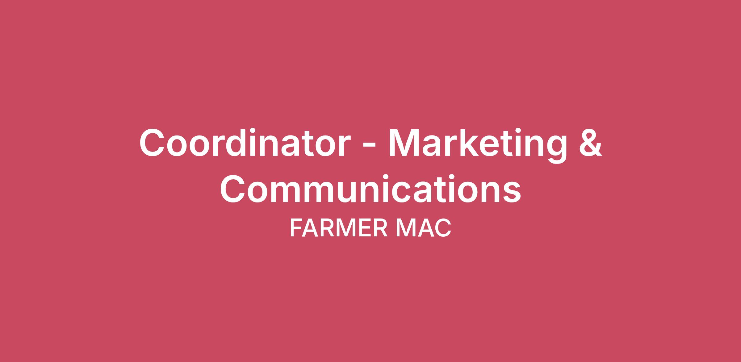 Serves as a key member of the Farmer Mac’s Marketing and Communications team, with full accountability for project management and implementation of the firm’s marketing and communications programs, strategies, tactics, including advertising, email, social media, website, collateral, and metrics reports.The People You Will Work WithThe position will report directly to the Vice President - Marketing and Corporate Communications and liaison with members of the Marketing & Communications team, internal stakeholders from various departments and external stakeholders as needed.Where and When You Will WorkFarmer Mac embraces a Presence with Purpose work environment, which allows for flexibility of work location while providing the opportunity for teams to come together in the office with purpose. The position can be based anywhere in the continental U.S. Farmer Mac headquarters are in Washington, D.C., and has a second location in Johnston, Iowa. Core business hours are Monday through Friday 8:30 am to 5:30 p.m. eastern time. Work outside of these times may be required for planned and unplanned activities to complete time sensitive projects or to attend off-site meetings or events. Periodic travel also may be expected of this position to meet with internal and external stakeholders.Primary Responsibilities and DutiesImplement and project manage social media posts, advertising and email campaigns, track results and recommend adjustments as appropriate.Project manage the development and updates of a variety of collateral including fact sheets, one-pagers, presentation slides and brochures.Update the company’s external corporate website as necessary.Implement and project manage all marketing related data in Salesforce, track results and recommend adjustments as appropriate.Implement and project manage Marketing & Communications metrics reports and recommend adjustments as appropriate.Manage general inquiries, filtering, and redirecting questions to the appropriate functional area representative. Develop and maintain a calendar for all marketing and communications activities, track results and recommend adjustments as appropriate.Work with the organization, as well as with outside vendors, including writers and graphic designers, to deliver marketing materials to internal and external customers within agreed-on business specifications and timelines.Required Skills and QualificationsTo perform this job successfully, an individual must be able to perform each essential duty satisfactorily. The requirements listed here are representative of the knowledge, skill, and ability required.Organizational and project management skills.Beginning to intermediate graphic design capacity and experience.Knowledge of Microsoft Office applications, Adobe Cloud Suite and HubSpot.Experience using LinkedIn campaign management tools.Ability to work with technology and grasp new concepts quickly.Strong attention to detail in composing, typing, and proofing materials, establishing priorities and meeting deadlines.Capability to work in a fast-paced environment with demonstrated ability to juggle multiple competing tasks and demands.Possess a willingness to step in and support team members with their tasks.Must have proven ability to handle sensitive and confidential situations.Flexibility and ability to work on several projects and deadlines simultaneously.Excellent interpersonal, people management and teamwork skills.Education and ExperienceBachelor’s degree in Communications, English, or Marketing. Other related areas of study or equivalent work experience may be considered.5+ years of experience in a marketing or communications role.Familiarity with agricultural industry preferred.Our compensation philosophy is targeted pay positioning relative to peers, our industry, and external markets. Farmer Mac is committed to a compensation program that will enable the organization to attract, motivate, reward, and retain highly skilled and creative talent to maintain sustained long-term performance and achieve the organization’s strategic business objectives. The typical starting salary range for this position is between $75,00–$100,00, although wages can vary based on experience and geography.
