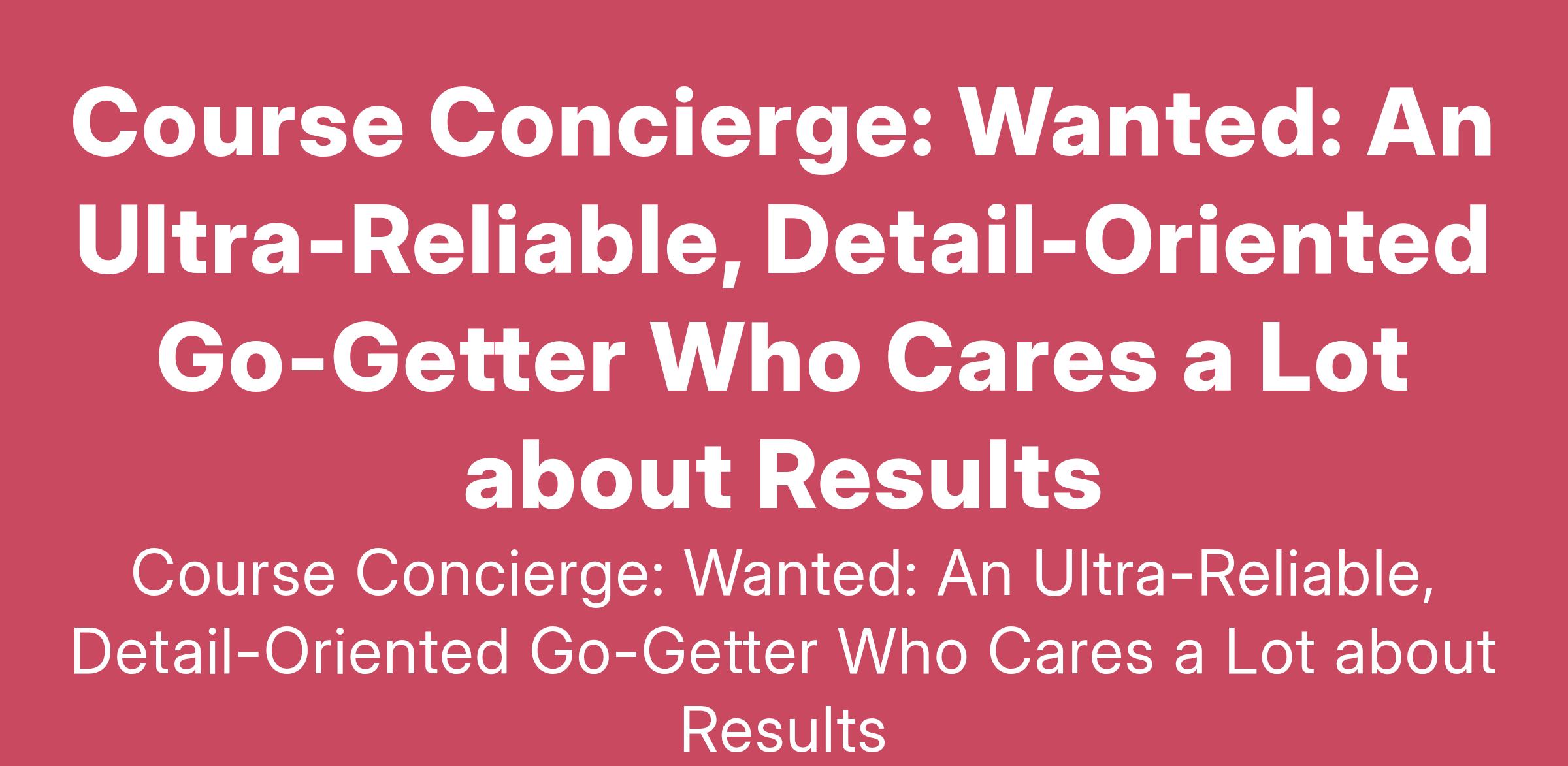 To apply: https://weworkremotely.com/remote-jobs/course-concierge-wanted-an-ultra-reliable-detail-oriented-go-getter-who-cares-a-lot-about-results