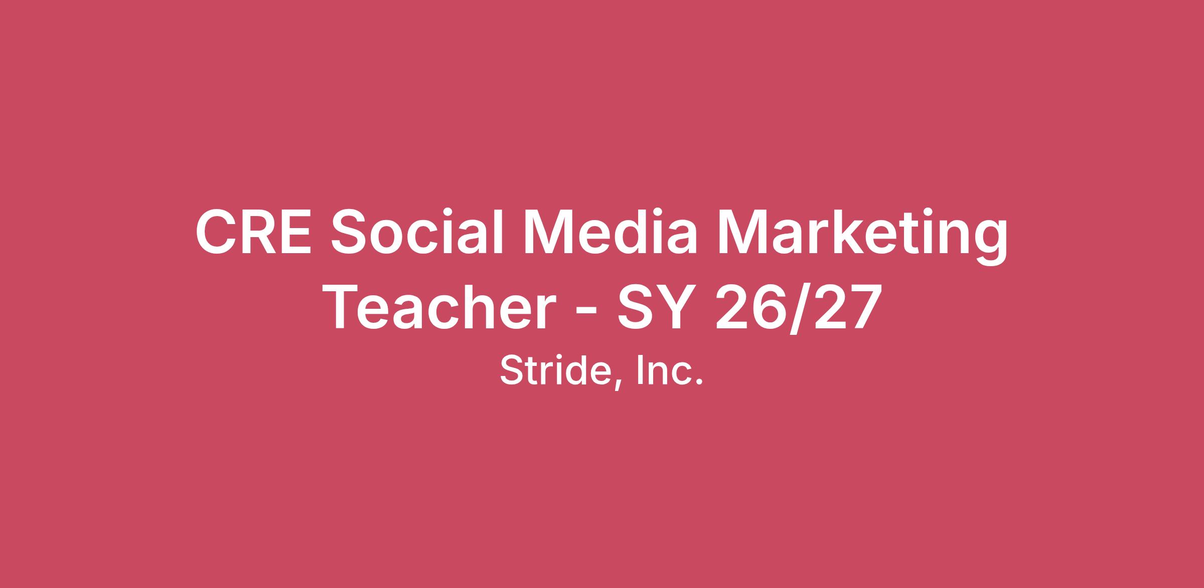 Job DescriptionRequired Certificates and Licenses:Any marketing or distributive education, certificate Marketing: Grades 6-12, Marketing Education: Grades 8-12, Any business or office education certificate, Any marketing or distributive education certificate, Business and Finance: Grades 6-12, Business Education: Grades 6-12 Residency Requirements: Texas Salary: $49,000 plus the eligibility of a performance bonus.Start Date: School Year 2026/2027.The remote CRE Social Media Marketing Teacher is state certified teacher and/or alternatively certified CRE/CTE Teacher responsible for delivering specific course content in an on-line environment. The CRE/CTE Teacher must also be a provide instruction, support, and guidance, manage the learning process, and focus on students' individual needs. Teachers monitor student progress through K12's learning management system, and work actively with students and parents to advance each students learning and to develop and monitor a plan for post-secondary success via online tools like Career Builder, Career Cruising, etc.K12, a Stride Company, believes in Education for ANY ONE. We provide families an online option for a high-quality, personalized education experience. Students can thrive, find their passion, and learn in an environment that encourages discovery at their own pace.Passionate Educators are needed at the Stride K12 partner school, Texas Virtual Academy of Hallsville (TVAH). We want you to be a part of our talented team!The mission of Texas Virtual Academy of Hallsville (TVAH) is to provide an exemplary individualized and engaging educational experience for students by incorporating school and community/family partnerships coupled with a rigorous curriculum along with a data-driven and student-centered instructional model. Student success will be measured by valid and reliable assessment data, parent and student satisfaction, and continued institutional growth within the academic community. Join us!This is a full-time REMOTE position. Ability to work independently, typically 40+ hours per week is required. Ability to maintain a professional home office without distraction during workday, typically 8am-5pm Central Time. ESSENTIAL FUNCTIONS: Reasonable accommodation may be made to enable individuals with disabilities to perform the essential duties.· Provides rich and engaging synchronous and asynchronous learning experiences for students· Commitment to personalizing learning for all students· Demonstrates a belief in all students’ ability to succeed and meet high expectations· Differentiates instruction based on student level of mastery· Augments course content according to prescribed policies and procedures using appropriate asynchronous and synchronous tools under guidance from principal and coach· Maintains grade book ensuring student academic integrity, makes student placement and promotion decisions, and alerts administrators to concerns about student performance and progress· Prepares students for high stakes standardized tests· Understands that a primary responsibility is to establish and maintain positive rapport with families and regularly communicates with and responds to students and learning coaches/parents in a timely manner· Supports learning coaches/parents with student curricular and instructional issues, as well as basic troubleshooting in a virtual classroom environment that is in line with academy policies and procedures· Maintains and effectively applies knowledge of the State, National, and Industry Specific learning standards· Develops effective instructional tools and strategies to supplement and enhance provided curriculum· Collaborates regularly with the school and national professional learning community· Administers and proctor's certification assessments where applicable· Serves as an Advisor for Career & Technical Student Organization· Supports CTE Program Coordinator/school/program with creating business and industry partnerships to help navigate work-based learning experiences for students· Supports a project-based learning model· Ability to travel up to 20% of the time for face-to-face professional development, student testing, and/or as required by the school.MINIMUM REQUIRED QUALIFICATIONS:· Bachelor's degree AND· Active state teaching license AND· Ability to clear required background checkOTHER REQUIRED QUALIFICATIONS:· Ability to work collaboratively with other teachers to interpret and produce numeric, tabular, and graphic representations of student data, and use it to drive instructional decisions.· Receptive to receiving coaching regularly with administrators and teacher trainers.· Ability to embrace change and adapt to ensure excellent student outcomes.· Proficient in Microsoft Excel, Outlook, Word, PowerPoint.· Ability to rapidly learn and adapt to new technologies and teaching platforms.· Ability to maintain teacher certification/professional development hours and fluency in K12 systems, programs and curriculum.DESIRED QUALFICATIONS:· Experience working with proposed age group.· Experience supporting adults and children in the use of technology.· Experience teaching in an online (virtual) and/or in a brick-and-mortar environment.· Experience with online learning platforms.WORK ENVIRONMENT: The work environment characteristics described here are representative of those an employee encounters while performing the essential functions of this job. Reasonable accommodations may be made to enable individuals with disabilities to perform the essential functions.· This is a home-based positionThe above job is not intended to be an all-inclusive list of duties and standards of the position. Incumbents will follow any other instructions, and perform any other related duties, as assigned by their supervisor. All employment is “at-will” as governed by the law of the state where the employee works. It is further understood that the “at-will” nature of employment is one aspe