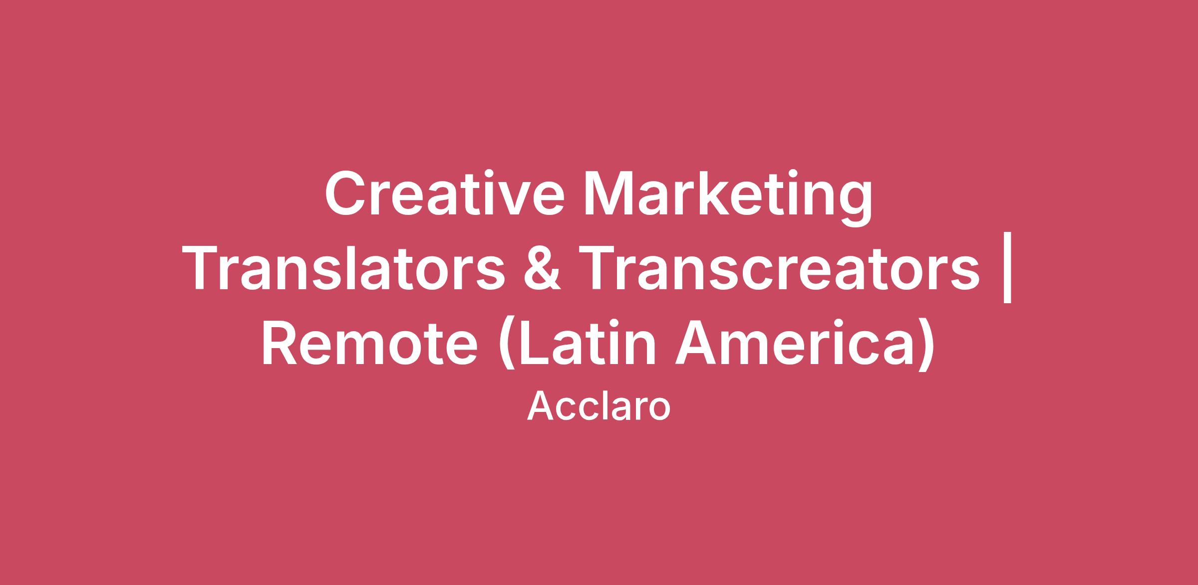 Acclaro combines cultural and language expertise with AI technology to help brands grow their global presence, connect with customers, and mean something to them. We are a trusted partner to some of the world’s biggest brands and fastest-growing global companies. Our mission is to harness the powerful combination of human expertise and cutting-edge technology, focusing on putting brands into the heads, hearts, and hands of people everywhere. Our AI-powered business management and language platform ensures a faster time to market with measurable results, while our global team of language, country, and technology experts crafts localization strategies that empower our customers to succeed in any market.We are seeking passionate Creative Marketing Translators & Transcreators to join our dynamic global community of linguists. If you have a knack for adapting marketing and entertainment content to resonate with diverse audiences in Latin America, we'd love to hear from you!Position OverviewLanguage Pair: English and Spanish (Latin America) Domain: Marketing, Entertainment, and Creative ContentExperience: 3+ years of translation and creative transcreation experienceLocation: 100% Remote – work from anywhere in Latin America (preferred locations: Puerto Rico, Ecuador or El Salvador)ResponsibilitiesTranslate and creatively adapt marketing, entertainment and multimedia content to engage and resonate with local audiences.Work collaboratively with internal and linguistic teams to ensure high quality output across various platforms.Conduct research to understand cultural nuances, ensuring that translations are not just literal but culturally relevant.Review and provide feedback on marketing projects to contribute to their success. Bachelor's degree in Translation, Marketing, Linguistics, or a related field.Proven experience of 3 or more years in translation and transcreation, preferably in a marketing context.Fluent in English and Spanish (Latin America), with exceptional writing skills in your target language.Strong understanding of marketing principles and the ability to adapt tone and style to fit various brand guidelines.Excellent communication skills, with an ability to collaborate effectively with diverse teams.Creativity and an eye for detail, capable of creating compelling and persuasive content.
