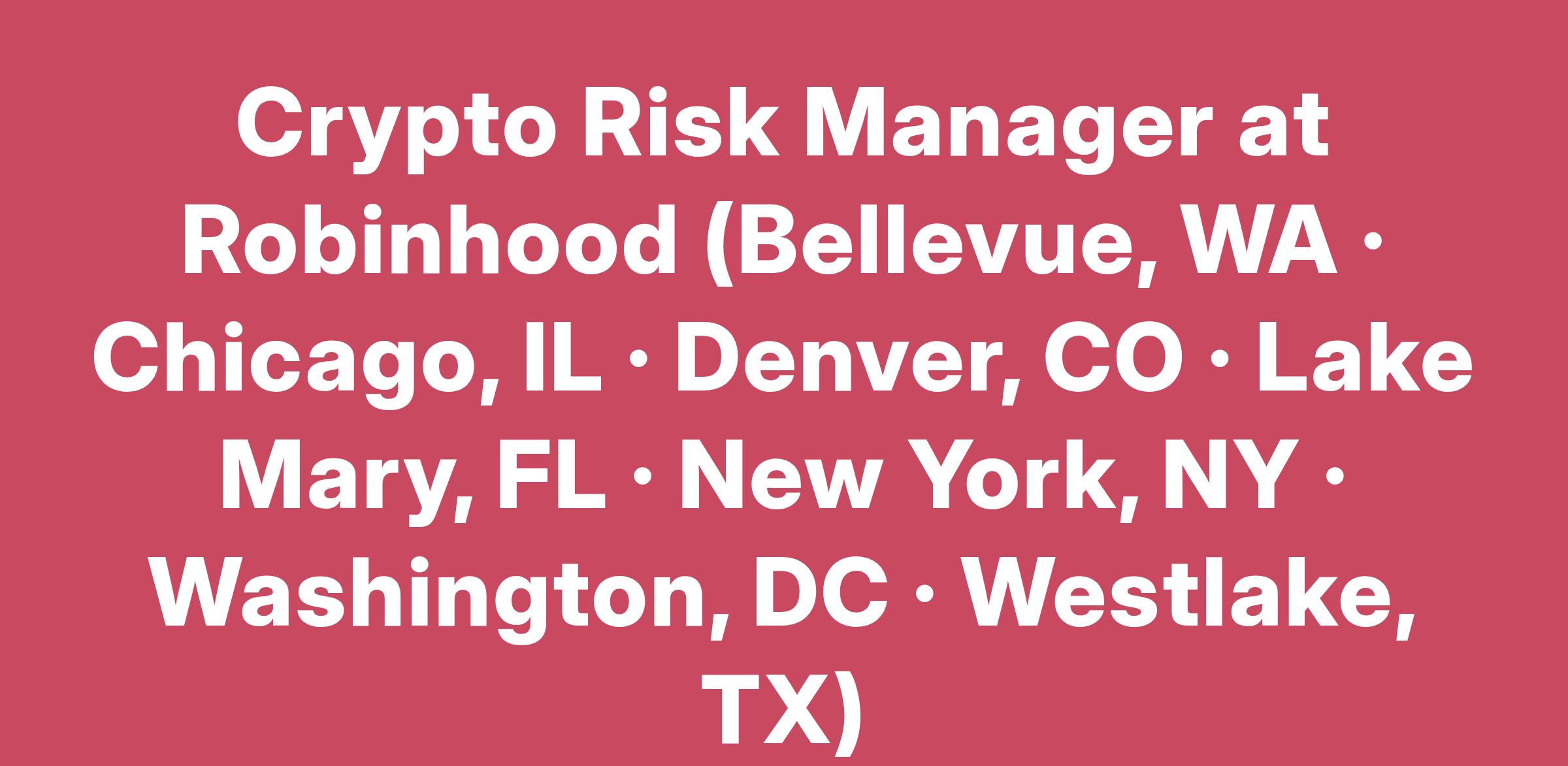 Crypto Risk Manager at Robinhood (Bellevue, WA · Chicago, IL · Denver, CO · Lake Mary, FL · New York, NY · Washington, DC · Westlake, TX)
