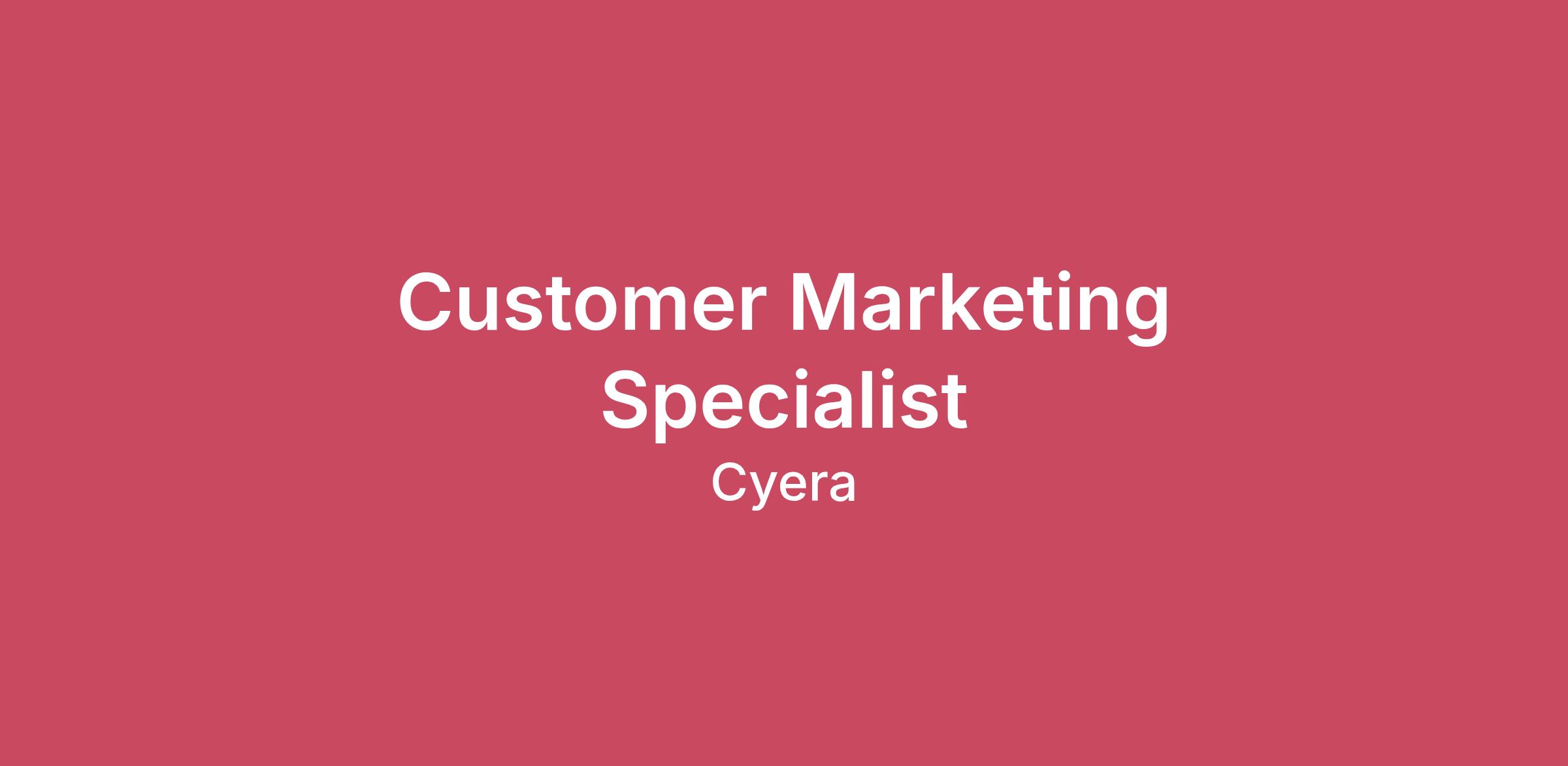 WHO WE ARECome join the company reinventing data security, empowering businesses to realize the full potential of their data. As the leading data security platform purpose-built for the cloud era, Cyera’s mission is to reinvent how businesses secure data, enable agile collaboration, and boldly pursue new business opportunities. Trusted by security teams at leading global businesses, our team is proving that data security is the next big thing in cyber. Backed by the world’s leading investors and working with a large and growing list of Fortune 1000 companies, we are looking for world-class talent to join us as we usher in the new era of data security.THE OPPORTUNITYCyera is seeking a dynamic and detail-oriented Customer Marketing Specialist to strengthen our relationships with customers and help tell their success stories that inspire trust and fuel growth. You’ll play a key role in expanding advocacy programs, refining customer data, driving engagement through communications, and supporting impactful events and campaigns that elevate the Cyera customer experience.This role is perfect for someone who thrives in a cross-functional environment, enjoys working directly with Customer Success, Product Marketing, and Sales, and wants to help customers become vocal champions of our brand.RESPONSIBILITIES:Customer AdvocacyIncrease customer reviews on G2 and Gartner Peer Insights through structured outreach and engagement.Support growth in Deeto signups and manage advocacy pipeline.Partner with Customer Success and Product Marketing to identify and create new customer stories, case studies, and testimonials.Coordinate customer reference requests for sales and content creation. Track and report on advocacy metrics (e.g., review volume, sentiment, and participation).Collaborate with design and content to bring customer stories to life through social, email, and events.Customer Marketing DataHelp refine and maintain customer data across Salesforce and other marketing tools.Collaborate with internal teams to ensure data accuracy for segmentation, targeting, and reporting.Analyze data to uncover opportunities for improved segmentation, personalization, and engagement.Customer CommunicationsSupport the production and delivery of the monthly customer newsletter and lifecycle touchpoints.Analyze and report on engagement metrics (open/click rates), driving continuous improvement.Campaign ExecutionAssist with lifecycle, adoption, and upsell campaigns (e.g., Omni DLP adoption).Partner with the Customer Success team on customer-focused content creation that drives measurable participation and pipeline impact.Event SupportHelp manage logistics, invites, and follow-up for key customer programs, including the Technical Advisory Board, virtual forums, and customer webinars.Collaborate with stakeholders to ensure seamless execution and strong customer participation. Requirements REQUIRED QUALIFICATIONS:0 - 4 years experience in customer marketing, customer advocacy, or related roles in B2B SaaS.Strong communication and storytelling skills with attention to detail.Familiarity with Salesforce, marketing automation platforms, and review platforms (G2, Gartner Peer Insights, Deeto).Proven ability to manage multiple projects simultaneously and meet deadlines.Collaborative, data-driven, and passionate about creating meaningful customer connections.6–12 Month Success Metrics3–5 new customer stories or case studies published per quarter.20% increase in customer reviews across G2 and Gartner Peer Insights.Consistent monthly newsletter delivery with improved open/click rates.Successful support of two major customer events (e.g., Technical Advisory Board, community launch).Established repeatable processes for advocacy, communications, and event execution.COMPENSATION INFORMATION: Compensation Range: $60,000-$80,000.The range represents total compensation, and may include company bonus, incentive for sales roles, equity or benefits, as applicable.This compensation range represents Cyera’s good faith and reasonable estimate of the range of possible compensation for this role at the time of posting, and Cyera may ultimately pay more or less than the posted range. The final salary for this position will be determined in Cyera’s sole discretion, consistent with applicable law, and based on a variety of factors, including but not limited to the employee’s work experience, skills, and qualifications for the role, as well as the needs of Cyera’s business and other operational considerations.Final compensation will vary based on seniority and relevance of experience, location, and position requirements.This role may be eligible for potential merit increases based on factors such as individual or company performance, time in role, and other discretionary factors.BENEFITS - Why Cyera? Ability to work remotely, with office setup reimbursementCompetitive salaryUnlimited PTOPaid holidays and sick timeHealth, vision, and dental insuranceLife, short and long-term disability insurance Location Requirements null