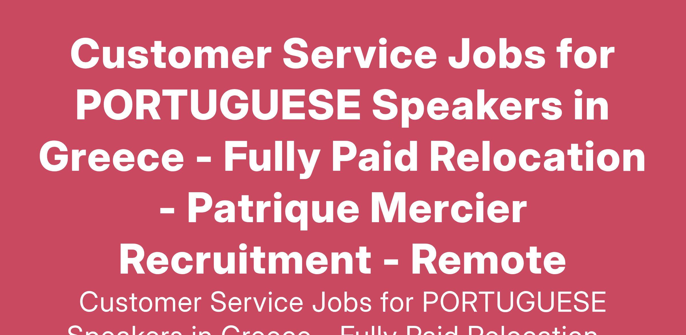 Patrique Mercier Recruitment is pleased to offer an exciting opportunity for Portuguese Speakers seeking customer service roles in Greece. This position comes with the added benefit of fully paid relocation, making it a fantastic chance to start a new adventure while advancing your career. Our agency specializes in connecting talented multilingual individuals with esteemed employers across various sectors, ensuring that candidates find the right fit for their skills and aspirations. As a Customer Service Representative focusing on the Portuguese-speaking market, you will provide exceptional support to customers, ensuring their inquiries are handled with care and professionalism. Join us in the vibrant landscape of Greece, where you can experience a rich cultural journey while developing your professional skills.