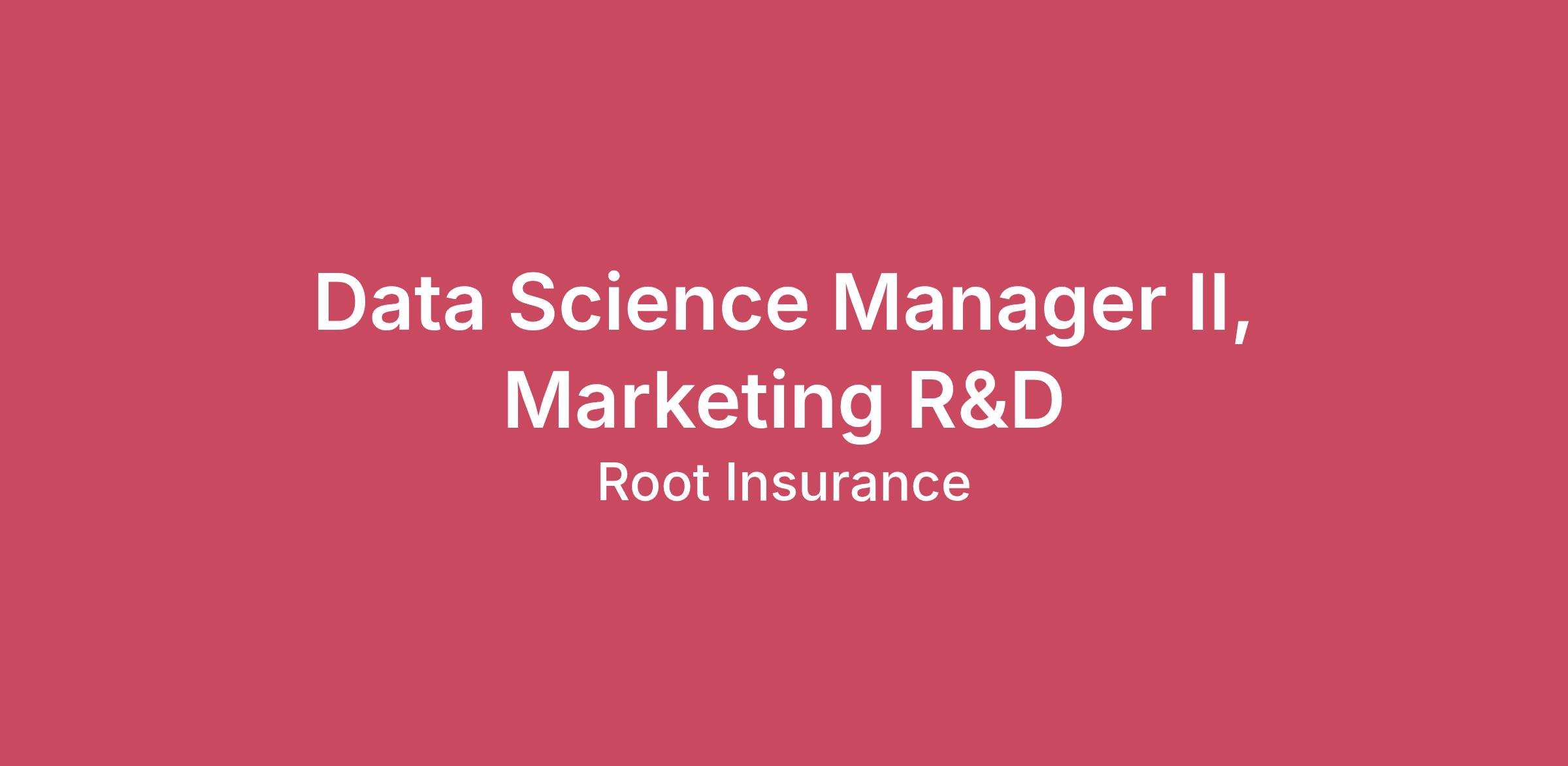 The OpportunityWe believe that a disruptive insurance company must have a principled quantitative framework at its foundation. At Root, we are committed to the rigorous development and effective deployment of modern statistical machine learning methods to problems in the insurance industry.At Root, the Quantitative Science team owns the majority of all marketing capital allocation, using quantitative methods to test, maintain, and enhance our marketing strategies across numerous distribution channels. As a Data Science Manager II, Marketing R&D, you will lead a team of data scientists and marketing specialists to scale Root’s mid- and upper-funnel marketing capabilities through disciplined research, experimentation, and execution.You will own the end-to-end execution of marketing experiments and campaigns, from hypothesis development and experimental design through launch and evaluation. You will apply a scientific approach to brand marketing, balancing executional discipline with quantitative rigor to measure incrementality, refine targeting and creative strategy, and guide marketing investment decisions. In parallel, you will lead a multi-year marketing R&D program to evolve the methodologies, systems, and tools that enable scalable experimentation and decision-making across channels.This role requires close collaboration with internal partners and external vendors to ensure campaigns run efficiently, measurement is credible, and insights are translated into operational capabilities. The ideal candidate brings structure to ambiguity, moves quickly without sacrificing rigor, and focuses on turning research and experimentation into durable business impact.Root is a “work where it works best” company, meaning we will support you working in whatever location that works best for you across the US. We will continue to have our headquarters in Columbus to give more flexibility and more choice about how we live and work.Salary Range: $178,419 - $245,326 (Bonus and LTI eligible)How You Will Make an ImpactLead a multidisciplinary team of data scientists and marketing specialists advancing Root’s mid- and upper-funnel marketing capabilitiesGuide a portfolio of greenfield marketing experiments from design through deployment, rigorous measurement, iteration, and scaleSet the long-term direction for marketing R&D, shaping the evolution of Root’s measurement and experimentation capabilities over timeIncrease R&D throughput and efficiency by improving experimental design, decision frameworks, and operating processesPartner closely with leaders across engineering, product, and creative to align roadmaps and translate research into production capabilitiesDevelop talent on the team through coaching and mentorship, raising the bar for technical rigor, execution quality, and business impactWhat You Will Need to SucceedAdvanced degree in a quantitative discipline (PhD preferred) and 5+ years of applying advanced quantitative techniques to problems in industry2+ years of experience in a leadership role, with a track record of enhancing team outputExpertise in experimental design and causal inference, including randomized experiments, geo-testing, and applied causal methodsTrack record of building and applying measurement frameworks that assess marketing campaign effectiveness and guide marketing investmentExperience with programmatic marketing platforms (e.g., DSPs), including audience building, targeting strategies, and attributionStrong programming skills with experience in SQL and Python or RDemonstrated ownership and judgment in identifying high-impact opportunities and driving them from concept to executionAbility to reason from first principles while effectively leveraging prior experience to navigate ambiguityClear, concise communicator with the ability to influence stakeholders and executivesAs part of Root's interview process, we kindly ask that all candidates be on camera for virtual interviews. This helps us create a more personal and engaging experience for both you and our interviewers. Being on camera is a standard requirement for our process and part of how we assess fit and communication style, so we do require it to move forward with any applicant's candidacy. If you have any concerns, feel free to let us know once you are contacted. We’re happy to talk it through.