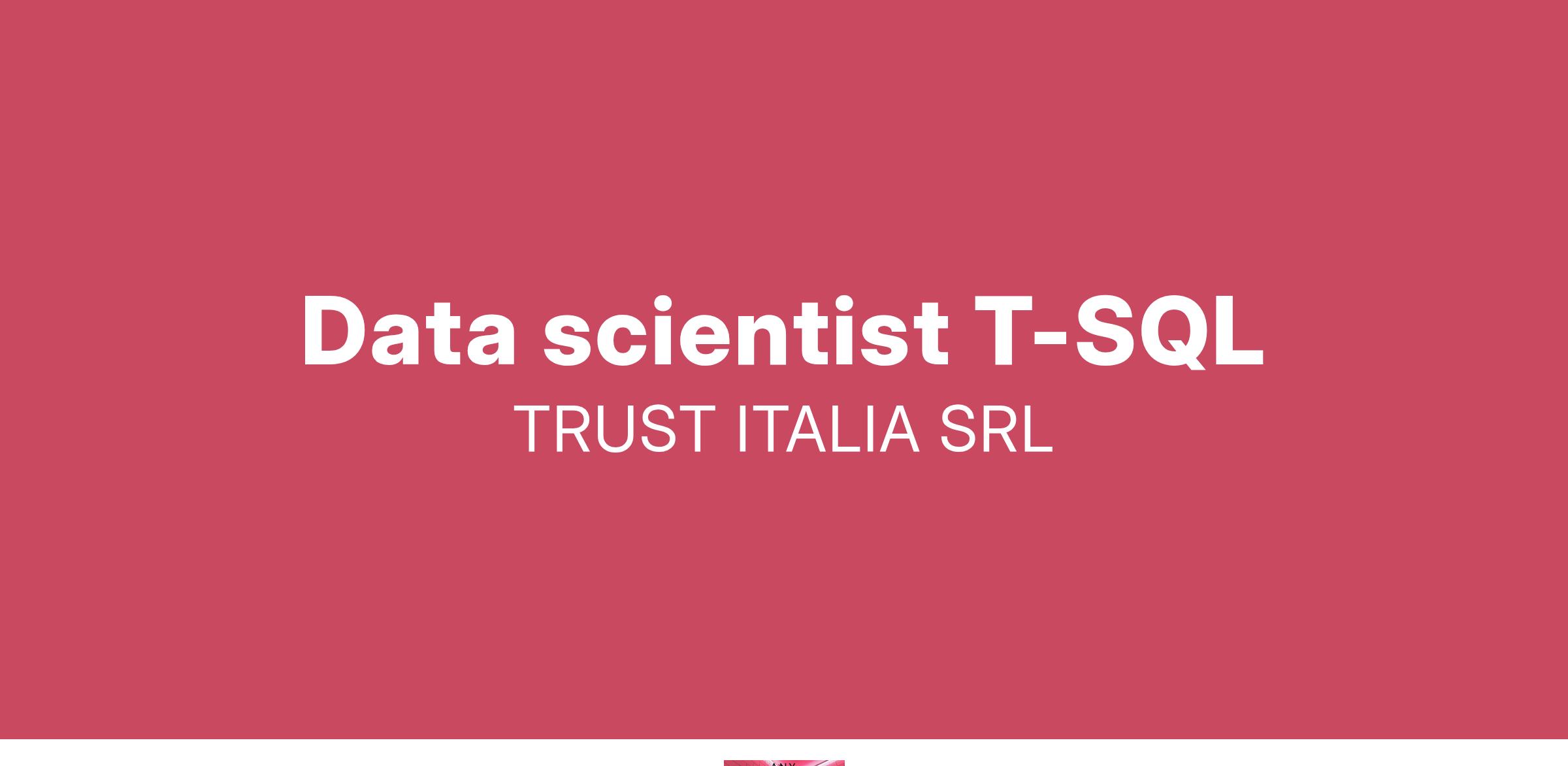 Trust Italia Srl è una società di consulenza informatica nata da professionisti del settore di decennale esperienza offre soluzioni globali per l’informatica negli ambienti web e non solo. Soluzioni che sono il punto d’incontro tra un ampio bagaglio di competenze progettuali e le più avanzate metodologie di sviluppo. Genera valore nelle aziende fornendo soluzioni in grado di far funzionare il loro business. Trust Italia ha un forte Know How in ambito bancario / Assicurativo nonché è fortemente legata allo sviluppo di applicativi custom per tutti gli altri settori tra cui : Servizi, Oil&gas, Sanità. Attualmente stiamo cercando: 1 Data scientist T-SQL Disponibilità immediata e/o a breve.