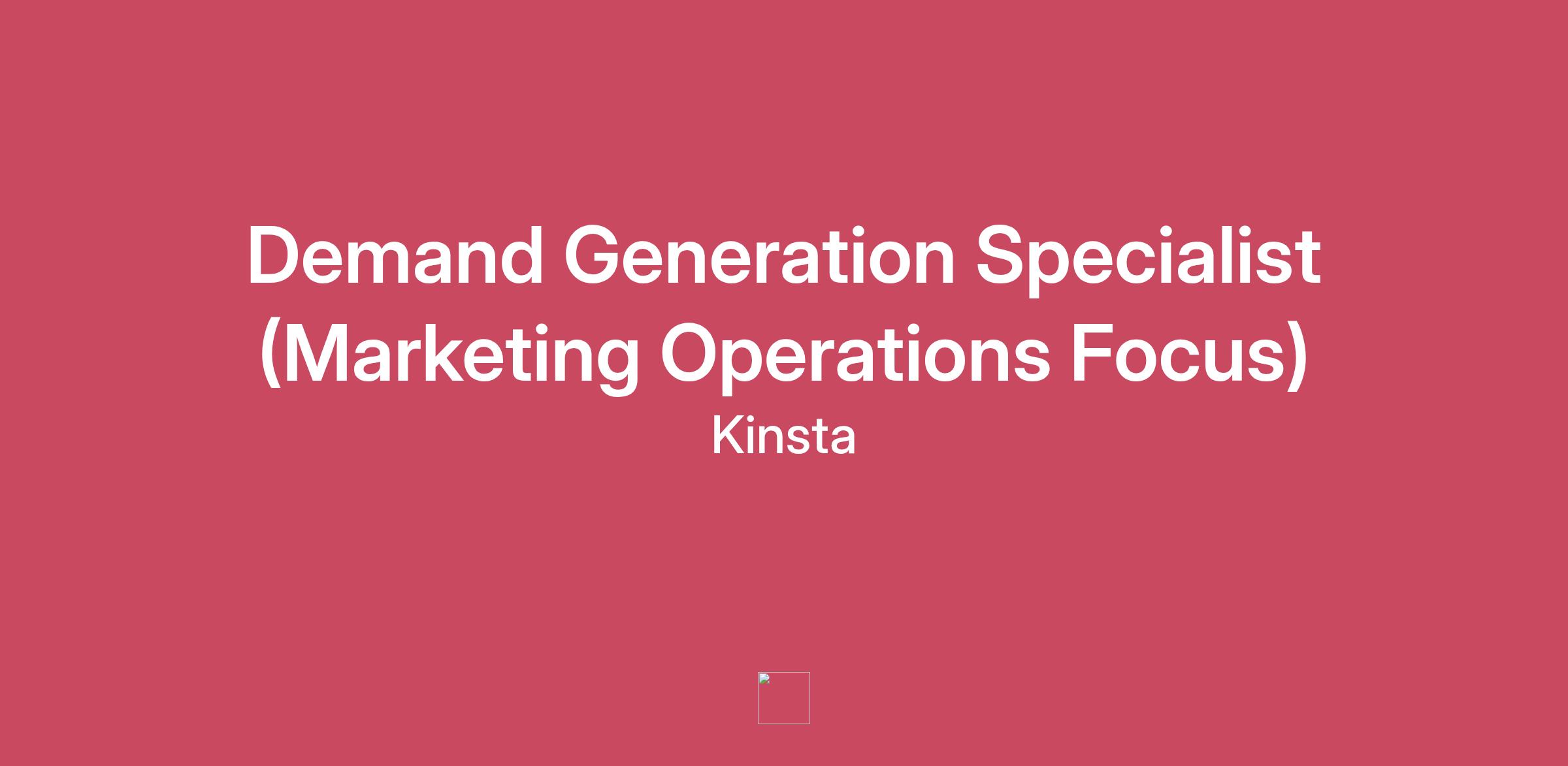 We’re looking for a Demand Generation Specialist with a marketing operations focus to turn data, automation, and process excellence into pipeline growth.In this role, you’ll make Kinsta’s demand generation programs more predictable, measurable, and scalable, helping bridge the gap between marketing activity and revenue impact. Working closely with the Events, RevOps, and Sales teams, you’ll support event campaigns, build email and intent programs, and turn marketing activity into meaningful sales conversations.This role is ideal for a marketer who's confident working independently but comfortable learning and collaborating across teams:\nWhat you'll own and build:Build and optimize intent programs:Identify and test new buying signals that help trigger timely, relevant sales conversations.Work with RevOps and Sales to put these signals into action and increase conversion rates to generate more sales-qualified leads.Review how qualified leads move through the funnel and partner with RevOps and Sales to identify ways to improve conversion and pipeline outcomes.Document and share learnings from intent signal tests to help improve targeting, messaging and sales processes.Launch scalable email programs:Develop and launch new email programs that drive sales conversations and pipeline opportunities.Ensure the marketing database stays accurate and usable by managing contacts, monitoring data quality, and keeping target lists clean for effective targeting.Find opportunities within the database by experimenting with segmentation and using available content to deliver value to targeted segments.Share learnings from email program results with the Sales and Content teams to improve messaging, targeting and content quality.Support event campaign operations:Plan and coordinate pre-, during-, and post-event campaigns in close collaboration with the Events and Sales teams.Support the integration of product and content campaigns into the overall event roadmap.Build simple, repeatable processes that make event campaigns more automated and impactful.Test and explore new channels;Test and pilot new marketing channels that could drive qualified leads and revenue.Experiment with tools and automations that make campaign operations more efficient and scalable.Track and share learnings from tests to identify what works, what doesn’t, and how to improve future campaigns.Contribute to Kinsta’s culture and values:Act with kindness, respect, and professionalism in every interaction.Put customers first, ensuring fairness and empathy in all decisions.Take ownership of your work and aim for high-quality results.Collaborate openly and value the expertise of your teammates.Think long-term and look for ways to improve how we work.Requirements:3+ years of experience in demand generation, growth marketing, or marketing operations, with a focus on driving B2B pipeline.Strong HubSpot expertise, including experience in email marketing, list management, workflows, and integrations.Good to have:Hands-on experience supporting sales-driven event campaigns end-to-end using HubSpot.Proven ability to collaborate closely with Sales and RevOps, with a solid understanding of B2B sales processes.Experience working with intent data and familiarity with data enrichment tools like Clay or similar GTM engineering platforms.Strong understanding of data hygiene and segmentation, with practical skills in Excel or Google Sheets (pivot tables, VLOOKUPs, and similar functions).Detail-oriented and proactive approach to managing multiple projects from strategy to execution.Our Benefits:Annual remote expense budget.Flexible PTO.Paid parental leave.Annual professional development budget: available after one year with Kinsta.Sabbatical: available after three years with Kinsta (and every three years thereafter).Location-specific healthcare benefits (including vision and dental) for employees hired in the USA, UK, and Hungary.Pension plan for employees hired in the UK, and 401k contributions for employees hired in the USA\nKinsta is proud to be an equal opportunity employer. We will not discriminate and we will take actions to ensure against discrimination in employment, recruitment, advertisements for employment, compensation, termination, promotions, and other conditions of employment against any employee or job applicant on the basis of race, color, gender, national origin, citizenship, age, religion, creed, disability, marital status, veteran’s status, sexual orientation, gender identity, gender expression, or any other status protected by the laws or regulations in the locations where we operate.By applying to one of our positions, you agree to the processing of the submitted personal data in accordance with Kinsta's Privacy Policy, including the transfer of your data to the United States.#LI-Remote, #IHSRemote