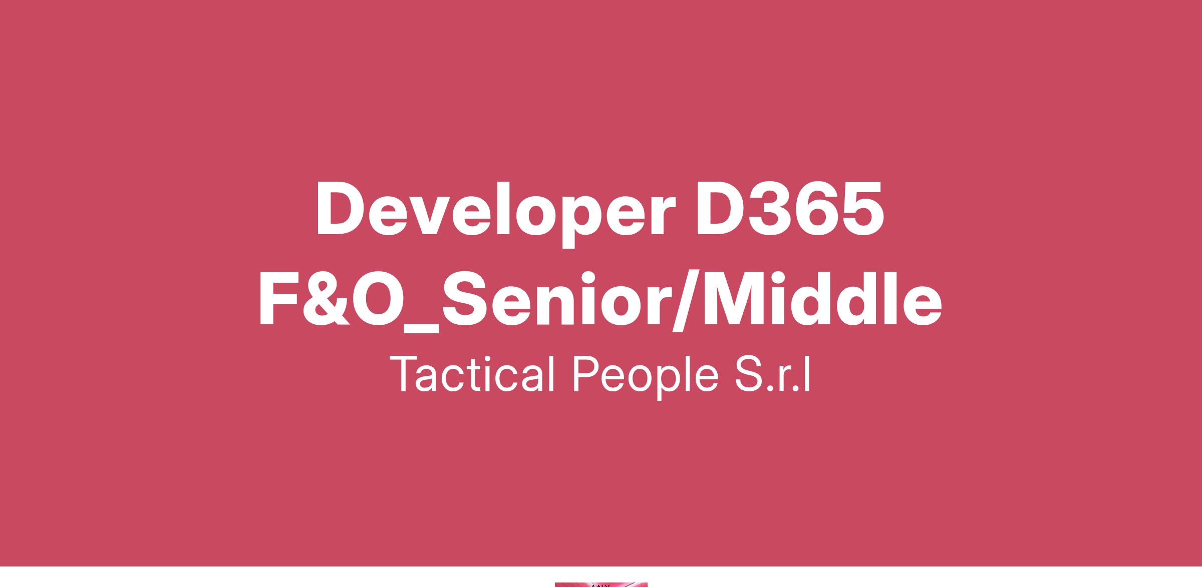 Unisciti a TACTICAL PEOPLE: Innovazione, Persone e Crescita nel Cuore della Digital Transformation Da oltre 20 anni, TACTICAL PEOPLE si posiziona come leader nel mercato ICT, guidando con passione e competenza i nostri clienti di medie e grandi dimensioni attraverso il dinamico percorso della digital transformation. La nostra mission è chiara: non solo abbracciare il cambiamento tecnologico, ma guidarlo, creando soluzioni all'avanguardia che plasmino il futuro digitale. In TACTICAL PEOPLE, crediamo fortemente nel mettere le persone al centro di ogni nostra iniziativa. Le persone sono il cuore pulsante della nostra azienda; il loro benessere, la loro crescita e il loro sviluppo sono la nostra priorità. Ci impegniamo a condividere le strategie aziendali con trasparenza e a fornire formazione e supporto a ogni livello, garantendo che ogni membro del team sia equipaggiato per eccellere e innovare. Stiamo cercando individui che condividano la nostra visione, che siano guidati dalla passione per la tecnologia e che desiderino essere protagonisti nella costruzione di un futuro digitale più luminoso. Se sei pronto a far parte di una squadra che valorizza il talento, incoraggia la crescita personale e professionale e lavora in prima linea nel settore della digital transformation, TACTICAL PEOPLE è il posto giusto per te. Posizione Aperta: Developer D365 F&O_Senior/Middle Sede: Remoto Descrizione del ruolo: Il candidato ideale deve avere esperienza di almeno 4/6 anni su D365 F&O. Cosa offriamo: Inserimento immediato in una Tech Community giovane e dinamica. TACTICAL LEARNING HUB, con corsi di aggiornamento e formazione. Il presente annuncio è rivolto ad entrambi i sessi, ai sensi delle leggi 903/77 e 125/91, e a persone di tutte le età e tutte le nazionalità, ai sensi dei decreti legislativi 215/03 e 216/03. I curricula dovranno pervenire completi di dicitura che autorizza il trattamento dei propri dati: “Si autorizza al trattamento dei dati personali ai sensi del D. Lgs. 196/2003.