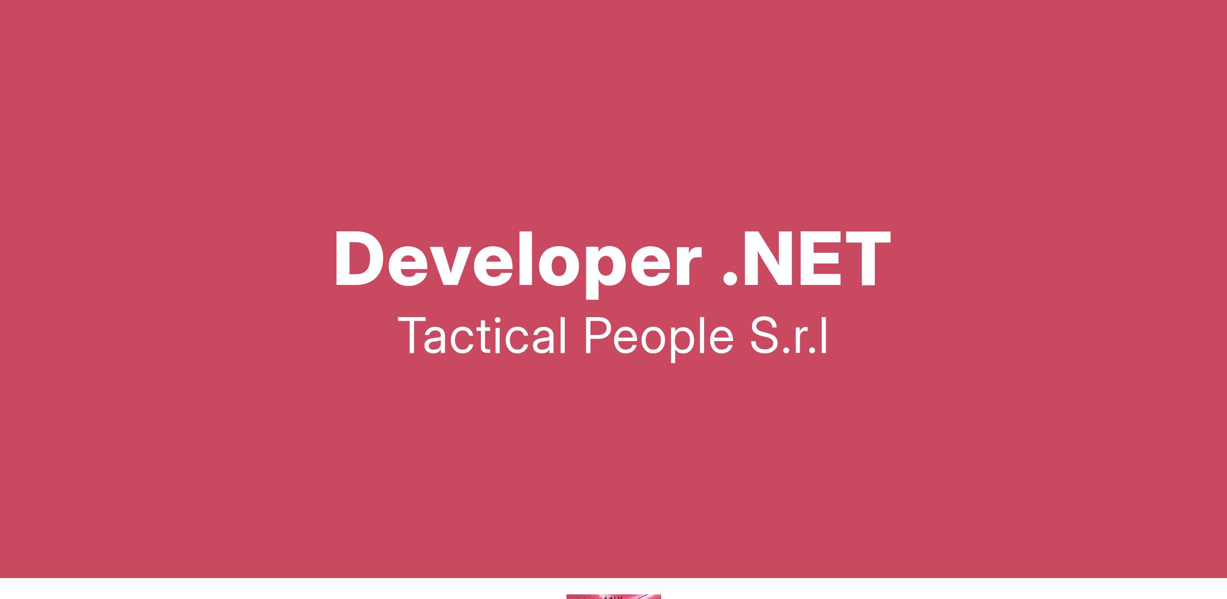 Unisciti a TACTICAL PEOPLE: Innovazione, Persone e Crescita nel Cuore della Digital Transformation Da oltre 20 anni, TACTICAL PEOPLE si posiziona come leader nel mercato ICT, guidando con passione e competenza i nostri clienti di medie e grandi dimensioni attraverso il dinamico percorso della digital transformation. La nostra mission è chiara: non solo abbracciare il cambiamento tecnologico, ma guidarlo, creando soluzioni all'avanguardia che plasmino il futuro digitale. In TACTICAL PEOPLE, crediamo fortemente nel mettere le persone al centro di ogni nostra iniziativa. Le persone sono il cuore pulsante della nostra azienda; il loro benessere, la loro crescita e il loro sviluppo sono la nostra priorità. Ci impegniamo a condividere le strategie aziendali con trasparenza e a fornire formazione e supporto a ogni livello, garantendo che ogni membro del team sia equipaggiato per eccellere e innovare. Stiamo cercando individui che condividano la nostra visione, che siano guidati dalla passione per la tecnologia e che desiderino essere protagonisti nella costruzione di un futuro digitale più luminoso. Se sei pronto a far parte di una squadra che valorizza il talento, incoraggia la crescita personale e professionale e lavora in prima linea nel settore della digital transformation, TACTICAL PEOPLE è il posto giusto per te. Posizione Aperta: Developer .NET Sede: Firenze – zona Osmannoro richiesta la presenza del 50% in sede Descrizione del Ruolo: Il candidato ideale deve avere minimo 3 anni di esperienza nello sviluppo .NET in un contesto professionale e buona conoscenza della lingua inglese per interazione con team internazionali. Cosa offriamo: Inserimento immediato in una Tech Community giovane e dinamica. TACTICAL LEARNING HUB, con corsi di aggiornamento e formazione. Il presente annuncio è rivolto ad entrambi i sessi, ai sensi delle leggi 903/77 e 125/91, e a persone di tutte le età e tutte le nazionalità, ai sensi dei decreti legislativi 215/03 e 216/03. I curricula dovranno pervenire completi di dicitura che autorizza il trattamento dei propri dati: “Si autorizza al trattamento dei dati personali ai sensi del D. Lgs. 196/2003.