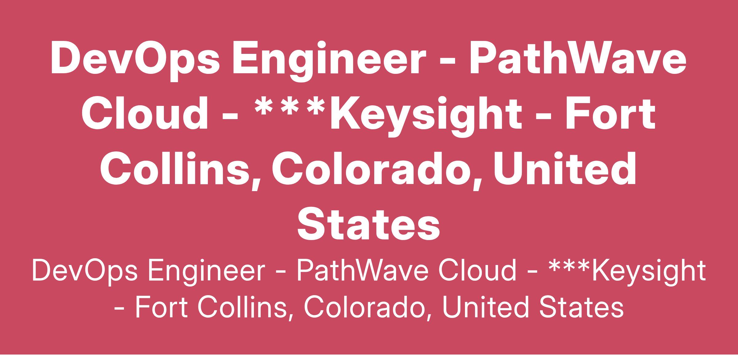 We’re recognized as a Great Place to Work across the globe due to our robust culture and dynamic working environment. Our global team acts as “One Keysight,” using collaboration, inclusivity, and integrity to advance technology. We’re driven and curious, and we value all ideas, especially bold ones. And our strong culture extends far beyond our own walls. We leverage our corporate social responsibility framework to support our communities, nurture the next generation of engineers, and promote environmental sustainability. Our technical solutions – and our methods for creating them – help connect and secure the world. Learn more about what we do and how we do it. DevOps Engineer – PathWave Cloud Role is based in Loveland, Colorado. Will consider Atlanta, GA as an optional work location Colorado Pay Range: $98,900-$164,830 Based on experience, education and skills, most offers will be between the minimum and the midpoint of the Salary Range listed above. Note: For other locations, pay ranges will vary by region Keysight Results Bonus Program Eligible US Employees may be eligible for the following benefits: ___________________________________________________________________________________ ***Keysight is an Equal Opportunity Employer.*** Candidates can be considered to work from the following locations: Americas : United States : Colorado : Loveland Job ID : 39179 Company Description