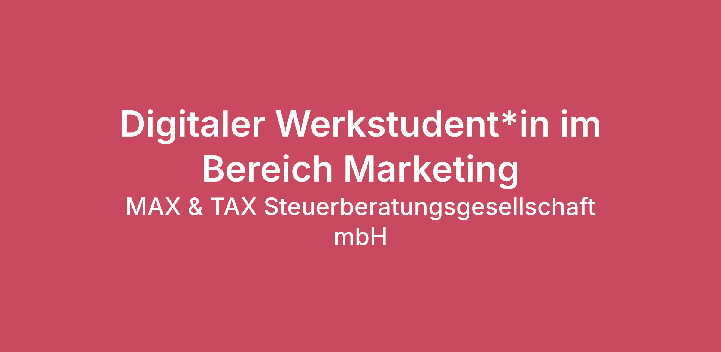 MAX & TAX ist eine innovative und zukunftsorientierte Steuerkanzlei, die modernste Technologien nutzt, um unseren Mandanten effiziente, flexible und maßgeschneiderte Steuerlösungen zu bieten. Unser Team arbeitet papierlos, automatisiert sowie cloud-basiert, und ist damit zu 100% digital! Unser Fokus liegt auf Start-ups, da diese unsere Leidenschaft für Digitalisierung teilen. Der Vorteil? Wir sind ortsunabhängig und betreuen dadurch Unternehmen aus der ganzen Welt. Wir legen dabei großen Wert auf fachliche Expertise und Beratung auf Augenhöhe. Denn wir haben es uns zum Ziel gesetzt auch noch so öde Steuerthemen anschaulich und vor allem verständlich zu erklären. Auch die Zusammenarbeit und Kommunikation innerhalb des Teams erfolgt auf Augenhöhe. Denn eine gute Arbeitsatmosphäre ist uns mindestens genauso wichtig! Aufgaben Betreuung unserer Accounts auf LinkedIn und Instagram Content Creation Planung von Marketingaktionen Organisation von Messeauftritten Erstellung und Aufbereitung von digitalen sowie physischen Werbeunterlagen Qualifikation Du bist Student*in im Bereichung Marketing und hast Interesse an Steuern und Buchhaltung Du hast Erfahrung im Umgang mit Canva, Adobe oder vergleichbaren Programmen Beim Thema Social Media fühlst du dich zuhause Du hast keine Angst davor selbständig zu arbeiten Du kannst es kaum erwarten ein Teil unseres Teams zu werden und mit uns zu arbeiten :-) English skills would be a great advantage! Benefits Bei uns bekommst du einen Arbeitgeber mit toller Start-up-Kultur. Angefangen von modernster Ausstattung über kostenlose Benefits (z.B. Getränke, Essen oder Bahntickets) bis zum Office-Hund ist bei uns alles vertreten. Ein tolles Team und ein Büro in zentraler Lage gibt es obendrauf. Wir bieten dir zudem Entwicklungsmöglichkeiten und unterstützen dich bei der persönlichen und beruflichen Weiterentwicklung. Von der Festanstellung bis zur Ausbildung zum Steuerberater ist bei uns alles möglich! Pssst! Wir sind zudem 100% digital. Flexible Arbeitszeitmodelle und die Möglichkeit zum mobilen Arbeiten verstehen sich von selbst! Falls wir dein Interesse geweckt haben, dann melde dich gerne. Ein Lebenslauf ist dabei vollkommen ausreichend. P.S. Du darfst uns gerne duzen!