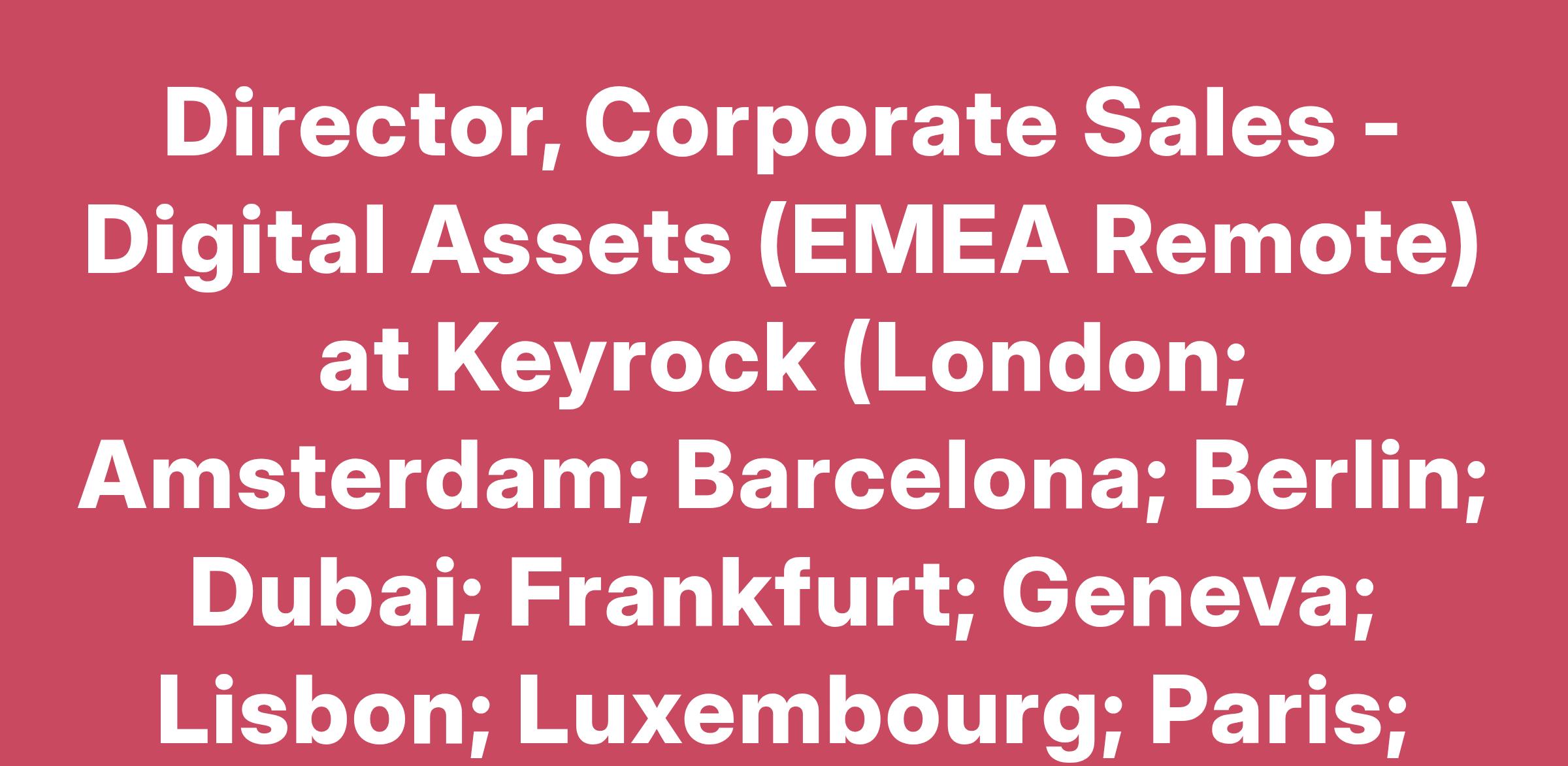 Director, Corporate Sales - Digital Assets (EMEA Remote) at Keyrock (London; Amsterdam; Barcelona; Berlin; Dubai; Frankfurt; Geneva; Lisbon; Luxembourg; Paris; Vienna ; Zug; Zurich)