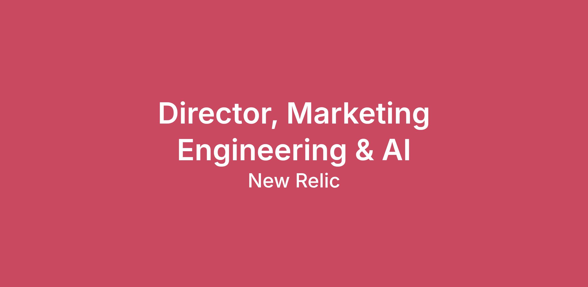 We are a global team of innovators and pioneers dedicated to shaping the future of observability. At New Relic, we build an intelligent platform that empowers companies to thrive in an AI-first world by giving them unparalleled insight into their complex systems. As we continue to expand our global footprint, we're looking for passionate people to join our mission. If you're ready to help the world's best companies optimize their digital applications, we invite you to explore a career with us!Your opportunity New Relic’s Growth Team is looking for a Director, Marketing Engineering & AI who will report to the VP, Growth Marketing Operations and Insights. This leader will be at the forefront of driving scale and efficiency across the entire marketing organization by spearheading the transition to AI-forward tooling and workflows. You will lead a team of technical marketers from the front, overseeing the implementation of new technology and process, guiding the broader adoption throughout the organization. In addition, you will be managing day-to-day campaign operations in support of marketing team initiatives, ensuring that our technical infrastructure effectively powers our growth strategies. A successful leader in this role is a collaborative, strategic problem solver with a heavy dose of AI leadership. You are great at collaborating with stakeholders both inside and outside of marketing to achieve an excellent prospect and customer experience that also balances the desired business result. Demonstrated successful experience in leading technical implementations and driving organizational change is essential. The opportunity to work from a remote office may be available depending on the applicant location. What you’ll do As a pivotal member of the Growth and Marketing team, you will: Lead Marketing Campaign Operations: Oversee the technical execution of campaign operations to support key marketing team initiatives and drive measurable results. Drive AI Strategy & Implementation: Evaluate and identify opportunities to use AI and emerging technologies to improve marketing results. Lead the transition to AI-forward workflows to increase scale and efficiency. Lead from the Front: Manage a team of technical marketers through problem solving in service of delivering business requirements and amazing prospect and customer experiences. Cross-Functional Collaboration: Partner with stakeholders across the company to ensure a seamless and excellent experience for both prospects and customers. Optimize Tech Stack: Partner with technology teams across the business to acquire, deploy, and maintain key marketing systems, ensuring they are integrated and optimized for revenue growth and business profitability. This role requires 8-10+ years of experience in marketing technology and marketing campaign operations. B2B Experience: Proven track record in a B2B enterprise technology or SaaS environment. AI Leadership: Demonstrated experience transitioning operations and B2B marketing teams to AI-forward tooling and workflows using Claude and/or other AI tools. Account Based Approach: Demonstrated success with ABM including (but not limited to) account scoring and modern account forward tools and marketing tactics. Technical Implementation: Proven success in leading technical teams through complex implementations and driving broad organizational adoption. Stakeholder Management: Exceptional ability to collaborate with and influence stakeholders inside and outside of marketing. Technology Expertise: Hands-on experience with key technologies such as Marketo, Salesforce, and AI-driven marketing tools. Education: Degree in business, marketing, (BS/BA) or equivalent experience. Bonus points if you have Experience with Claude (Cowork, Code, etc) and other workflow or agentic AI tools. Experience in a high-growth digital marketing environment. Experience with product led growth and self service. Experience driving revenue and retention within a large enterprise customer base. Masters/MBA. Please note that visa sponsorship is not available for this position. #LI-MM1 #LI-RemoteThe pay range below represents a reasonable estimate of the salary for the listed position. This role is eligible for a corporate bonus plan. Pay within this range varies by work location and may also depend on job-related factors such as an applicant’s skills, qualifications, and experience. New Relic provides a variety of benefits for this role, including healthcare, dental, vision, parental leave and planning, and mental health benefits, a 401(k) plan and match, flex time-off, 11 paid holidays, volunteer time-off, and other competitive benefits designed to improve the lives of our employees.Estimated Base Pay Range$180,000—$243,000 USDFostering a diverse, welcoming and inclusive environment is important to us. We work hard to make everyone feel comfortable bringing their best, most authentic selves to work every day. We celebrate our talented Relics’ different backgrounds and abilities, and recognize the different paths they took to reach us – including nontraditional ones. Their experiences and perspectives inspire us to make our products and company the best they can be. We’re looking for people who feel connected to our mission and values, not just candidates who check off all the boxes. If you require a reasonable accommodation to complete any part of the application or recruiting process, please reach out to resume@newrelic.com. We believe in empowering all Relics to achieve professional and business success through a flexible workforce model. This model allows us to work in a variety of workplaces that best support our success, including fully office-based, fully remote, or hybrid. Our hiring processIn compliance with applicable law, all persons hired will be required to verify identity and eligibility to work and to complete employment eligibility verification. Note: Our stewardship of the data of thousands of customers me