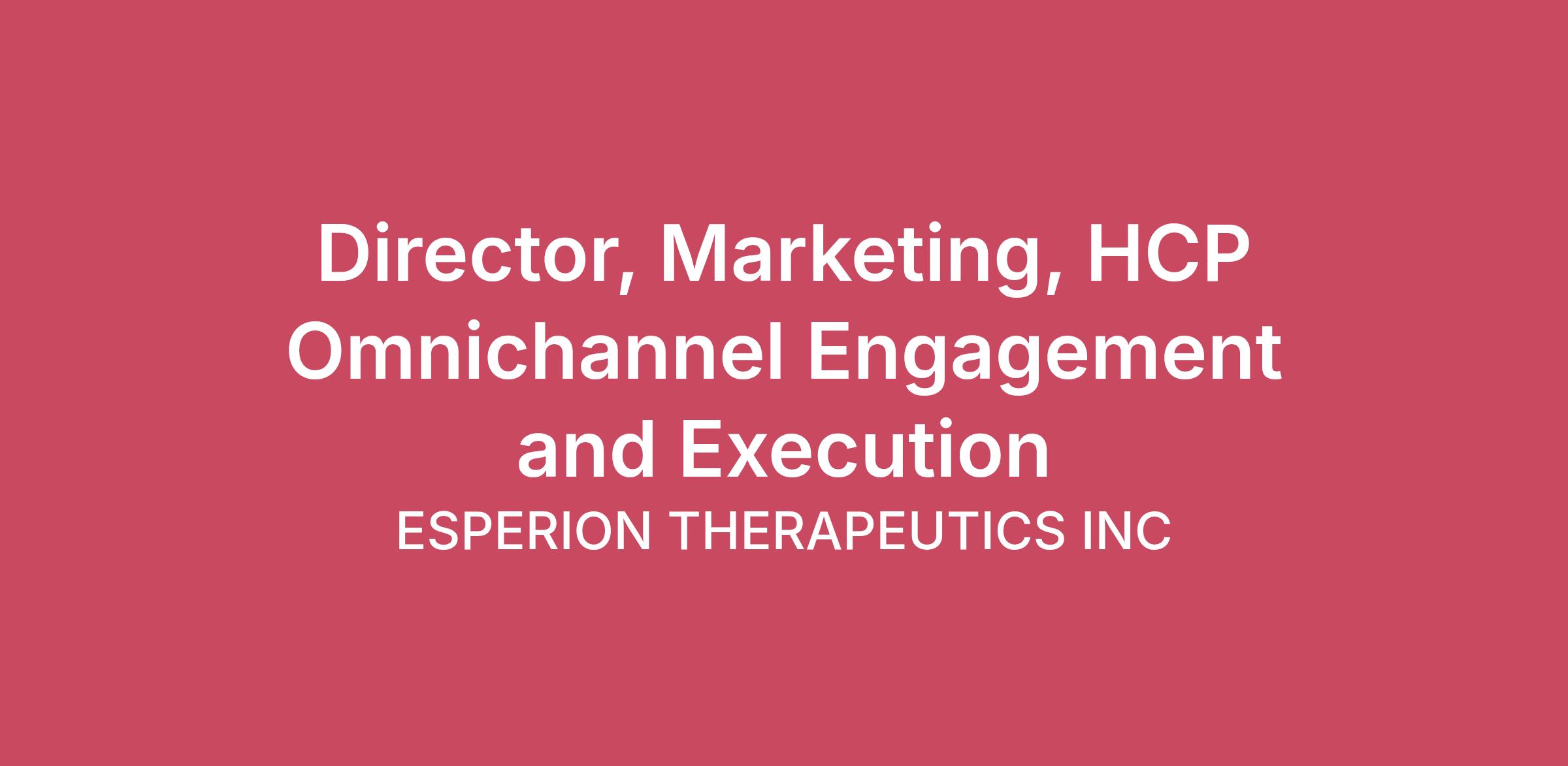 Company OverviewOur Mission: At Esperion, we are working tirelessly to deliver innovative medicines that help patients reach their goals today, tomorrow, and into the future. Esperion is a fully remote based company with a corporate headquarters located in Ann Arbor, MI. The Company offers a competitive salary including a performance-based bonus program and stock-based compensation, a comprehensive benefits package including a 401(k) matching plan and health insurance, and paid time off and holidays.Position Title: Director, Marketing, HCP Omnichannel Engagement and Execution The Director, Marketing, HCP Omnichannel Execution is responsible for driving digital engagement and promotional execution for healthcare professionals (HCPs) for a launch-stage heart failure pharmaceutical brand, ENBUMYST. This role leads digital campaign strategy, omnichannel execution, media planning, content development, congress activities, speaker programs, and marketing analytics to support brand growth and customer engagement.This position plays a critical role in building the brand’s digital ecosystem and scalable engagement model during launch.Preferred Location: Remote – US Essential Duties and Responsibilities* HCP Omnichannel Digital PromotionDevelop and execute digital engagement strategy and media plan for HCP audiencesLead digital tactics including:Email campaignsProgrammatic mediaProfessional brand websitePaid and organic searchPeer-to-peer 3rd party programs Congresses and Speaker Programs: Lead development of promotional speaker deck and provide oversight of speaker bureau.Develop relationships with key opinion leaders and external stakeholders.Lead Congress activities, including developing of strategies and tactics to increase awareness of Enbumyst, manage Congress partners, and coordinating KOL meetings. Foster and manage relationships with key professional and patient advocacy organizations. Content Development & MLRLead development of HCP promotional materials, including digital, speaker programs, and congress materials Manage the MLR review process Partner with medical, legal, and regulatory teams to ensure compliant promotion Agency & Vendor ManagementManage relationships with digital, media, and creative agenciesOversee project timelines, budgets, and deliverables Analytics & OptimizationTrack and analyze campaign performance and engagement metrics, including ROI Use insights to optimize digital programs and targetingDeliver regular reporting on digital performance and impact*additional duties and responsibilities as assignedQualifications (Education & Experience)Required: Bachelor’s degree and 10 years of pharmaceutical or healthcare marketing experience; or equivalent education and experienceExperience in the PromoMats system (or equivalent MLR review system) is requiredStrong experience in digital and omnichannel pharmaceutical marketing, including media planning, content development, and managing agency partners. Marketing analytics and performance optimizationStrong understanding of pharma promotional regulationsExceptional interpersonal and communication skills to effectively drive performance within a highly results driven organizationProven initiative and ability to work independently; demonstrated ability to drive execution of key initiatives in partnership with cross functional stakeholders, and meet all deadlinesPreferred:MBA or advanced degree Pharmaceutical launch experienceExperience in developing and implementing promotional medical education and working with KOLsCongress experienceHeart Failure experience