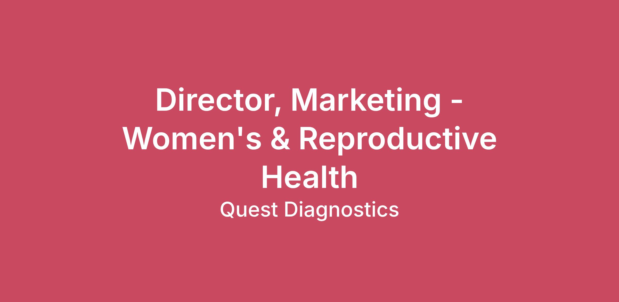 The Women’s and Reproductive Health (WRH) Marketing Director will serve as the Marketing lead for the WRH product team. This individual will develop marketing insights and strategic marketing plans to fulfill franchise priorities, drive execution through collaboration with customer marketing teams, and liaise with Commercial sales, franchise product leaders, and medical teams. This position may be based remotely within the U.S. Quest Diagnostics honors our service members and encourages veterans to apply. While we appreciate and value our staffing partners, we do not accept unsolicited resumes from agencies. Quest will not be responsible for paying agency fees for any individual as to whom an agency has sent an unsolicited resume. Equal Opportunity Employer: Race/Color/Sex/Sexual Orientation/Gender Identity/Religion/National Origin/Disability/Vets or any other legally protected status.