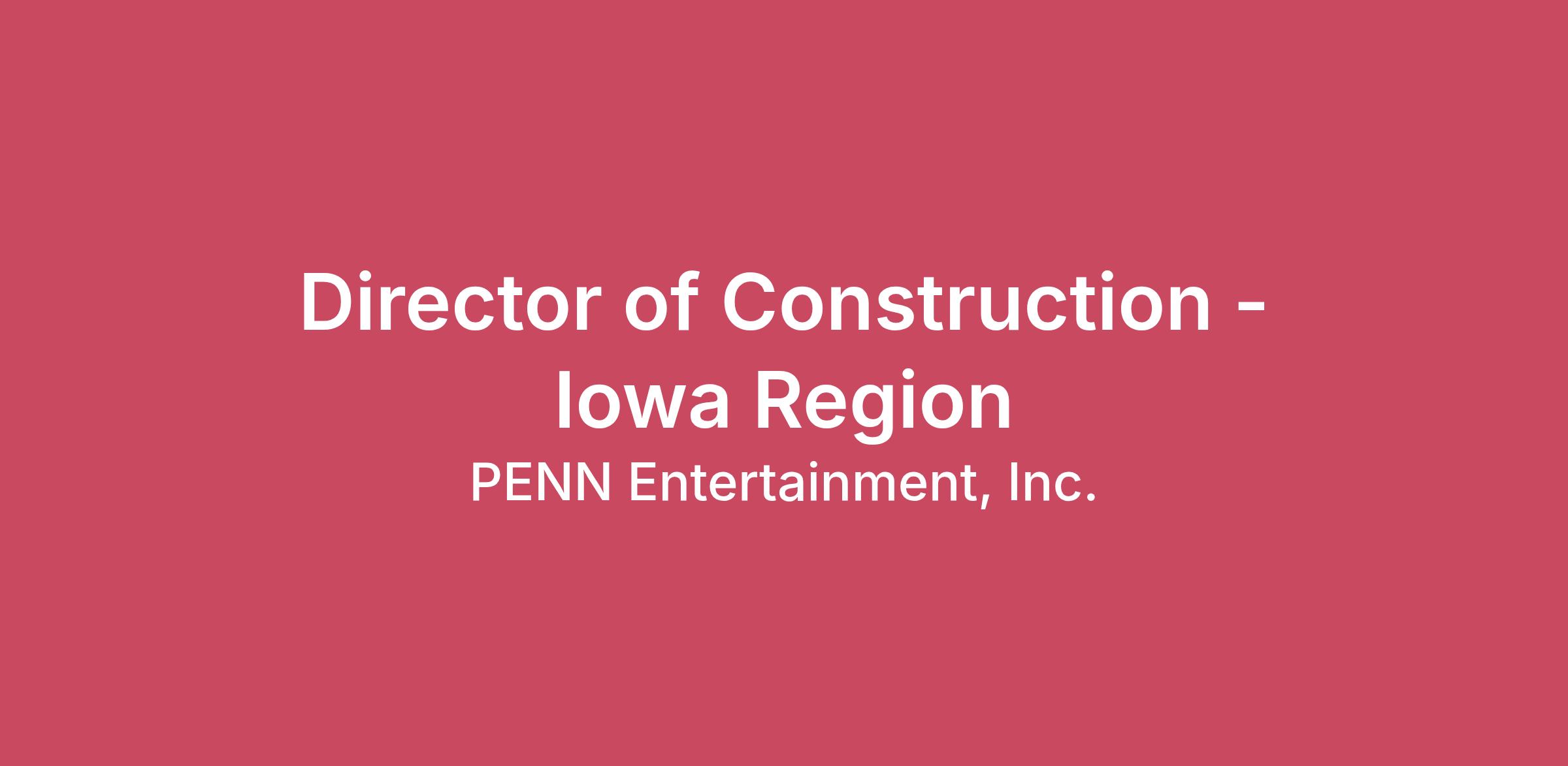 The Director of Construction for the Iowa region is responsible for the development and implementation of Capital Projects (New, Remodel and R&M) from Concept Stage through construction completion and operational turnover. The Director is involved with the overall project as it relates to design management and coordination, schedule, budget, contracting, assessment & coordination of operational needs, maintaining design intent, and the day-to-day management and on-site coordination of Capital Projects. Also partners with the VP of Design & Construction, Departmental Project Leaders and Strategic Sourcing Department as related to construction FF&E purchasing, property operations and other relative positions to ensure projects remain on budget and on schedule. The position reports to the VP of Design and Construction and will focus on our existing and any new locations in the Iowa market.