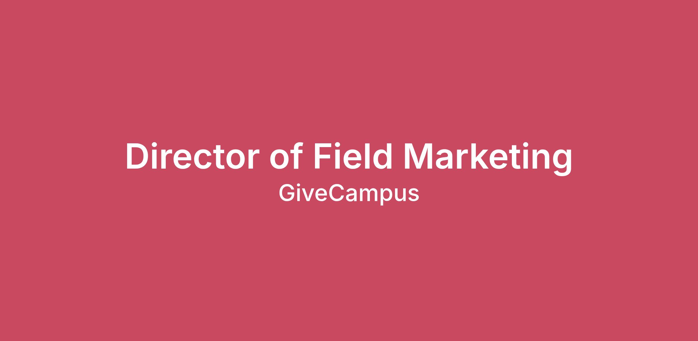 GiveCampus is the world's leading fundraising platform for non-profit educational institutions. Trusted by 1,300+ colleges, universities, and K-12 schools, our mission is to help advance the quality, the affordability, and the accessibility of education. We received a seed investment from Y Combinator in 2015 and have pursued a strategy of 'Sustainable Growth' ever since: achieving six consecutive years of profitability and positive cash-flow while more than quadrupling our revenue, our customer base, and our team. In 2022, we raised $50 million to accelerate the next stage of our growth. Through The GiveCampus Social Mobility Initiative, we've donated $1 million in free fundraising support for programs that help low-income students, first-generation students, and underrepresented minorities. And in 2022 and 2023, we were named to Y Combinator's Top Companies list and the Inc. 5000 list of America's fastest-growing private companies. While we operate at meaningful scale (we've facilitated more than $6 billion in charitable giving), we’re still small relative to the commercial and social good opportunities in front of us. Every GiveCampus employee has a substantial impact on our trajectory, and we're growing to help schools achieve even greater results. Our purpose-driven team of 120+ is located across the US: team members work from anywhere they choose. We have a beautiful 12,000 sf office in Washington, DC that is available for people to use whenever they want, and we regularly organize team meet-ups, events, and retreats in various locations. We're looking to expand our team with diverse and collaborative doers who believe in our mission and the transformative power of affordable, high-quality education.Location: This is a remote-first role based in the U.S. While we embrace flexible, distributed work, we also value in-person connection. Team members are expected to attend multiple company-wide and team-specific onsites throughout the year.About the Role GiveCampus is looking for a Director of Field Marketing to lead and continue scale our field marketing programs — the primary engine for building brand awareness and generating pipeline. This person will own the strategy, execution, and optimization of 50+ in-person events and 85+ digital events and manage a team of three. What You'll Do Develop and execute the annual field marketing plan spanning GiveCampus-hosted regional events, sponsored conferences and school association events, and persona-specific programming for key audiences like alumni relations leaders and VPs of advancement. Own GCPC (GiveCampus Partner Conference), our flagship annual event and largest single marketing investment — including agenda development, speaker curation, persona-focused session tracks, sponsor engagement, logistics oversight, and post-event roadshow planning. Oversee a robust digital webinar program producing 85–100+ sessions per year, ensuring a balanced mix of commercial prospect-facing and partner utilization content. Manage and develop a team of three: a Field Marketing Specialist (external sponsored events and registrant analysis), a Webinar and Digital Field Marketing Coordinator (full webinar lifecycle), and a Field Marketing Coordinator (logistics, collateral, and expense tracking) Lead recurring cross-functional syncs with Business Development, Demand Generation, and Partner Success — briefing reps on event registrant insights, surfacing senior-level contacts for outreach, and ensuring field marketing activity translates directly into commercial opportunity. Own a $1M+ field marketing budget, manage vendor relationships for venues, speakers, and agencies, and report on ROI across all programs Oversee the marketing technology that supports field operations, including but not limited to Replit, Notion, Claude, and HubSpot. What You'll Bring 7+ years of experience in field marketing, event marketing, or demand generation, with at least 2 years in a people management role. Equal parts strategic vision and hands-on execution — you can set a 12-month roadmap and also roll up your sleeves to get an event over the finish line. Proven track record of building and running field marketing programs in a B2B SaaS environment. Experience managing six-figure+ event budgets and reporting on pipeline impact and ROI. Comfort presenting to and building relationships with senior leaders both internally and externally. Strong cross-functional partnership skills, with experience working closely with Sales, Business Development, and Customer Success teams. Ability to thrive in a fast-paced, remote-first environment where the team executes events weekly. Please note this role requires travel of 30%. Ready to apply? Be sure to keep an eye on your spam and promotions boxes in case our emails end up there! At GiveCampus, we value diversity and we pledge to foster an environment of support, inclusivity, and learning, both on the job and throughout the application process. In this spirit, we encourage candidates of all backgrounds to apply. GiveCampus is an Equal Opportunity Employer. Applicants and employees are not discriminated against because of race, color, creed, sex, sexual orientation, gender identity or expression, age, religion, national origin, citizenship status, disability, ancestry, marital status, veteran status, medical condition or any protected category prohibited by local, state or federal laws. If you feel like you don't meet all of the requirements for this role, please apply anyways. We know confidence gaps and imposter syndrome often get in the way of connecting with incredible people, and we don't want them to prevent us from meeting you.