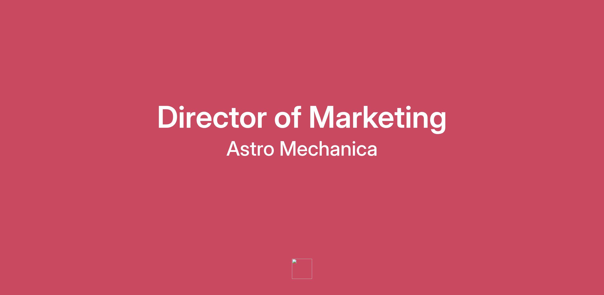 ABOUT US:Astro Mechanica is a vertically integrated aerospace company building a faster, more connected future. Our mission is to democratize high-speed flight by making supersonic travel flexible, accessible, and sustainable. We believe that rapid, on-demand, point-to-point global mobility will become the new standard for moving people and goods across the planet. To achieve this, we are integrating our advanced airframe and engine technologies—which include Duality™, our proprietary dual-use propulsion system—with a new flight operations model to make supersonic transport as efficient and economical as commercial air travel is today. In the near term, we are developing adaptable, high-speed systems to close aircraft performance gaps for the United States government.WHO WE ARE:We're a team of hardcore engineers who live and breathe aerospace. We’re generalists who each have subject matter expertise and operate in a flat organizational structure. We move fast and build world-changing technology in a pragmatic and competent workplace culture.WHO YOU ARE:You are a recognized leader in brand and communications with a strong aesthetic sense and an instinct for narrative. You’ve shaped brand and run marketing for rapidly growing companies—ideally in aerospace, defense, or other technically complex domains—and you’re as comfortable defining strategy as you are executing it. You are an outstanding writer and editor, capable of translating sophisticated technology into clear, compelling messaging for diverse audiences.WHAT YOU’LL DO:As Director of Marketing, you will build and own Astro Mechanica’s brand and marketing engine from the ground up. You will craft the narrative, lead campaigns, and ensure our story is told with clarity, credibility, and conviction across every external touchpoint.Specifically, you will:Define and steward Astro Mechanica’s brand voice, visual identity, and messaging system.Lead design and creative resources to produce high-impact content for investors, talent, partners, and senior U.S. government and defense leadership.Oversee the creation of compelling, on-brand content across web, presentations, announcements, and long-form formats.Elevate the voices of Astro Mechanica’s leadership through differentiated thought leadership, public commentary, and executive communications.Partner closely with leadership on investor-facing materials, including fundraising decks, investor updates, milestone announcements, and strategic narrative.Ensure all external-facing materials are cohesive, polished, and aligned with our brand and business objectives.Build and lead a small, high-output marketing and creative team over time.WHAT WE’RE LOOKING FOR:8–12+ years of experience in marketing, brand, and/or strategic communications.Proven experience building or significantly reimagining brand and marketing from an early stage—ideally as Director/Head of Marketing, Director/Head of Communications, or similar senior role.Demonstrated success running campaigns that drove hiring and revenue outcomes.Exceptional writing and editing skills, with a portfolio spanning executive comms, web copy, decks, and long-form content.A passion for aviation or defense technology.Strong creative taste and experience collaborating closely with designers and video teams to produce cohesive, on-brand work.Ability to deeply understand technical products and translate them into buyer- and candidate-friendly messaging.Comfortable operating both strategically and tactically—designing the strategy and also doing the execution.Experience leading and developing small, high-output creative/marketing teams.Bay Area location a plus; remote with travel acceptable.PERKS & BENEFITS:Comprehensive medical, dental, and vision insurance, including Flexible Spending Accounts (FSA)401(k) program and transparent stock option planSelf-managed and flexible time-off policy, including PTO, paid holidays, and sick timeFlexible work environmentADDITIONAL INFORMATION:Astro Mechanica is an equal opportunity employer. We proudly recruit and hire a diverse workforce and are committed to creating an inclusive environment for all employees.