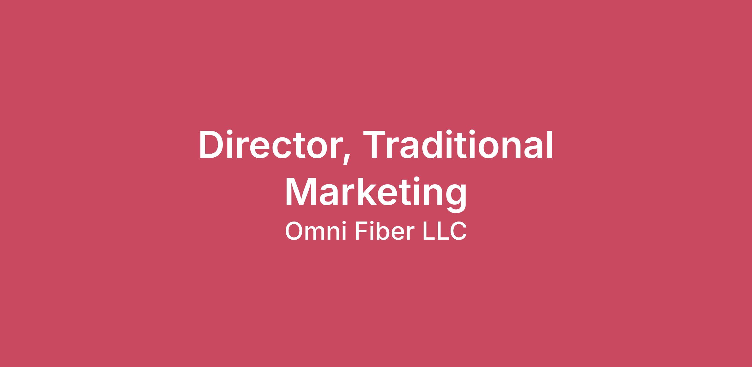 Director, Traditional Marketing Help power the future of connectivity. At Omni Fiber, we're building more than blazing-fast internet-we're connecting communities with reliable, future-ready fiber technology. As we expand rapidly across the Midwest, we're looking for a hands-on marketing leader to shape our brand and accelerate growth. We're looking for a best-in-class, hands on Director of Traditional Marketing to lead lead the strategy and execution of traditional and cross-channel marketing-developing high-impact campaigns that build awareness, drive engagement, and deliver measurable results. Partnering closely with sales, digital, product, and analytics teams to bring integrated marketing programs to life that resonate locally and scale nationally. What You'll Do•Lead traditional marketing strategy across direct mail, print, outdoor, events, sponsorships, radio, and community‑based initiatives.•Establish and steward Omni Fiber's brand across markets, ensuring messaging reflects our promise of speed, reliability, transparency, and local service.•Own creative briefing and oversee development of compelling campaigns and customer communications.•Manage agency and vendor relationships, priorities, performance, and timelines.•Own and optimize a multi‑million‑dollar marketing budget and channel mix to maximize ROI.•Analyze campaign performance and deliver clear insights and recommendations to executive leadership.•Collaborate cross‑functionally to ensure seamless, integrated campaigns across all customer touchpoints. What You Bring•Bachelor's degree in Marketing or a related field required; MBA preferred.•10+ years of progressive marketing experience, including 3+ years in a leadership role.Deep expertise in traditional marketing channels and integrated campaign planning.•Proven success driving revenue growth and exceeding performance goals through marketing.•Strong analytical skills with the ability to translate data into action.•Excellent communication skills and executive presence.Why Omni FiberOmni Fiber is a fast‑growing, future‑focused telecommunications company backed by strong investment and driven by a mission to bring world‑class fiber connectivity to underserved and growing communities. You'll join a collaborative, high‑impact team where your work directly influences how people live, work, and connect. Our Benefits Financial & Retirement• 401(k) with employer matching contribution up to 4%• HSA with $2,000 employer contribution Time Off & Work‑Life Balance• 15 days paid time off• 8 paid company holidays• 3 floating holidays Health & Protection• Generous medical, dental, and vision coverage• Life insurance and short‑term disability Additional Perks• Monthly internet and cell phone allowances Work Environment•Remote role with flexibility •Fast-paced, collaborative, and growth-oriented culture •Occasional extended hours based on business needs Join UsIf you're ready to build, optimize, and scale a high-impact digital marketing engine, we'd love to meet you. Omni Fiber is an Equal Opportunity Employer. All employment decisions are based on qualifications, merit, and business needs.