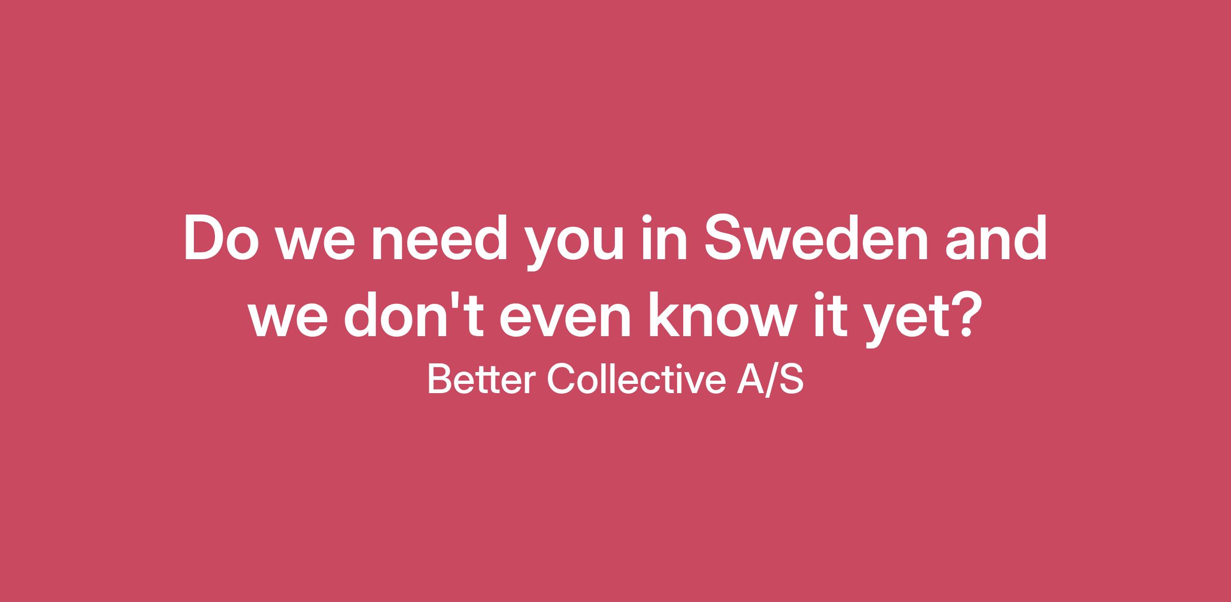 Thank you for visiting Better Collective. We're happy to know that you want to join our team and take part in our journey to become the leading digital sports media group. We always like to hear from you and if you did not find your dream job among our open positions do not hesitate to send us an unsolicited application.