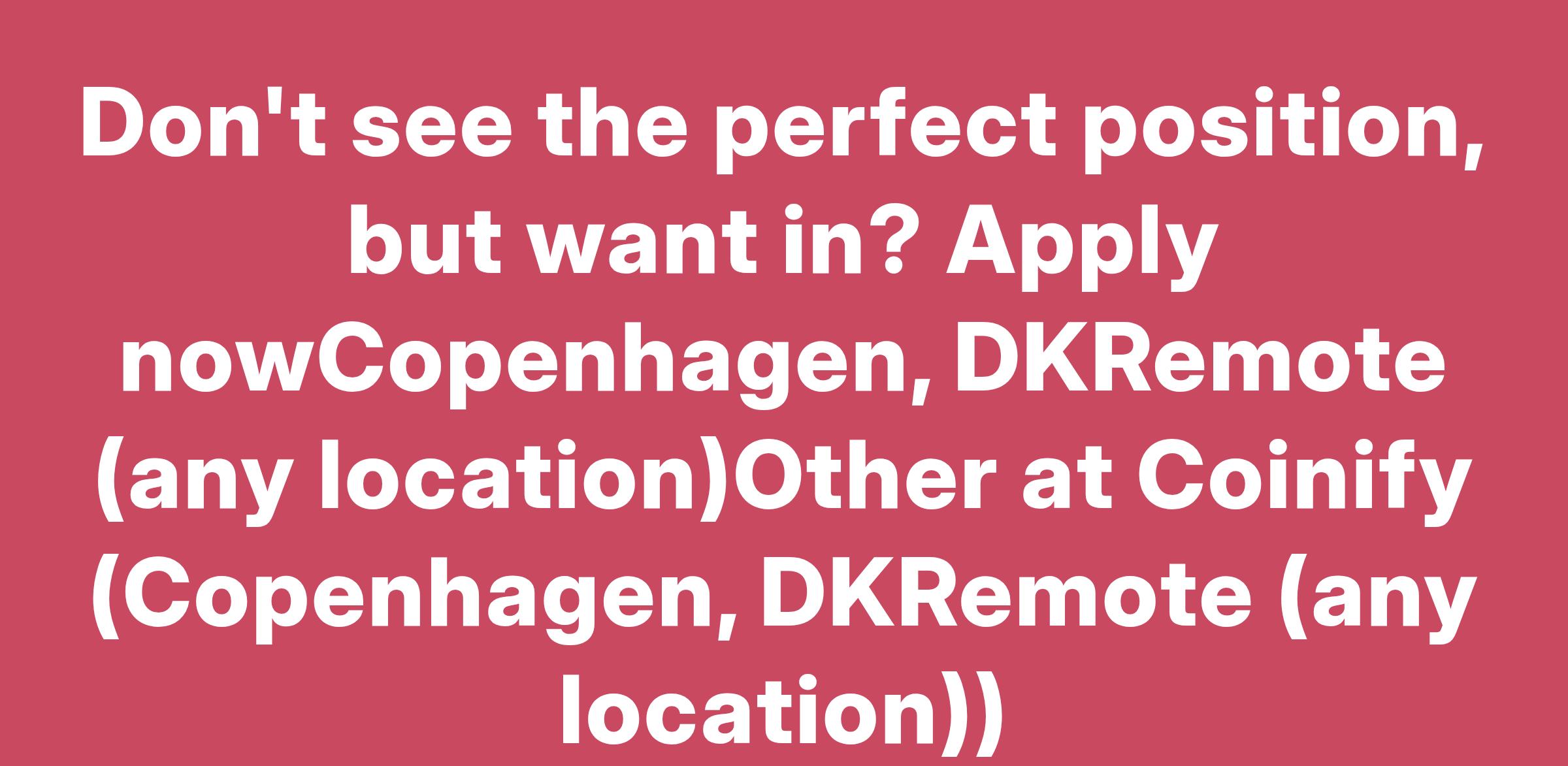 Don't see the perfect position, but want in? Apply nowCopenhagen, DKRemote (any location)Other at Coinify (Copenhagen, DKRemote (any location))