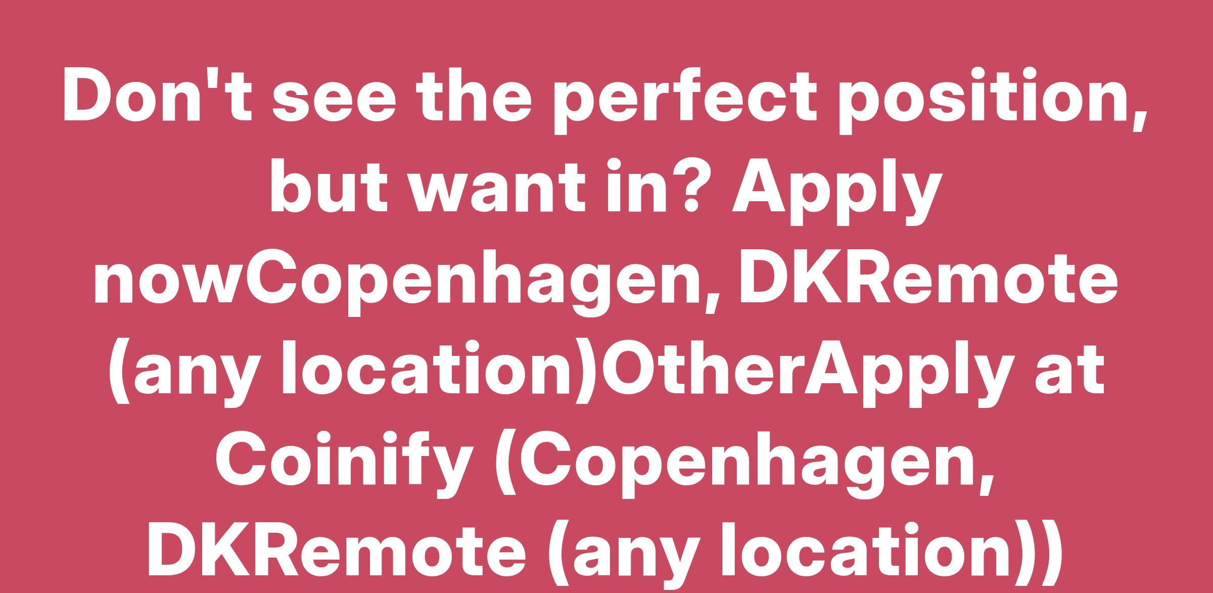Don't see the perfect position, but want in? Apply nowCopenhagen, DKRemote (any location)OtherApply at Coinify (Copenhagen, DKRemote (any location))