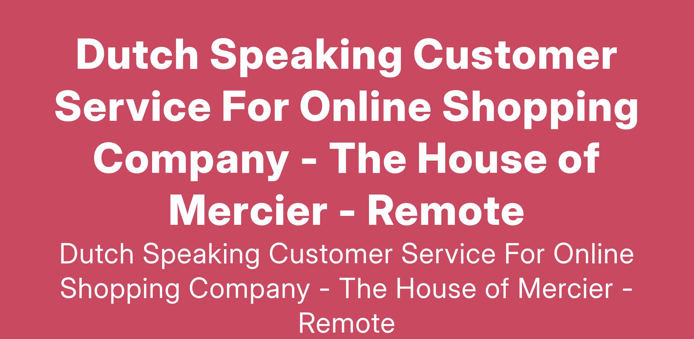 The House of Mercier is an innovative recruitment agency dedicated to matching talented individuals with exciting career opportunities across the world. We are currently seeking a Dutch Speaking Customer Service representative to join a leading online shopping company that prides itself on providing exceptional service to its customers. In this dynamic role, you will have the opportunity to engage with a diverse range of clients while leveraging your language skills to enhance their shopping experience. Your main goal will be to ensure customer satisfaction by addressing queries, resolving issues, and providing product information efficiently and professionally. This position calls for individuals who are passionate about customer service and who thrive in fast-paced environments. We believe that great customer service is the backbone of any successful business, and we are excited to bring on board someone who shares this belief. If you are fluent in Dutch and looking for a rewarding opportunity to be part of a vibrant team within a growing industry, we encourage you to apply.