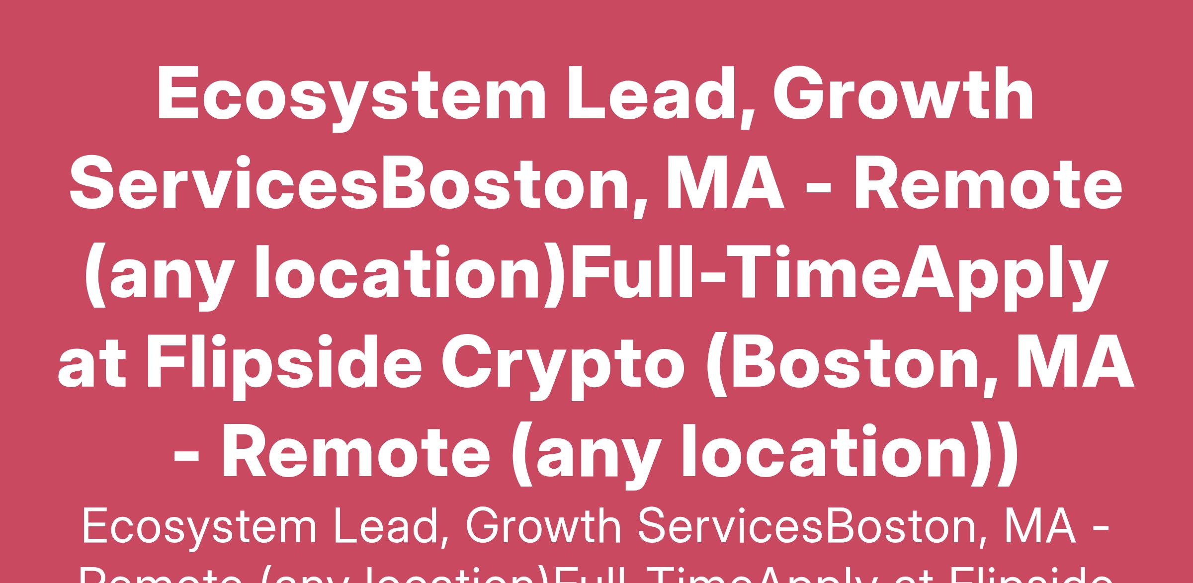 Ecosystem Lead, Growth ServicesBoston, MA - Remote (any location)Full-TimeApply at Flipside Crypto (Boston, MA - Remote (any location))